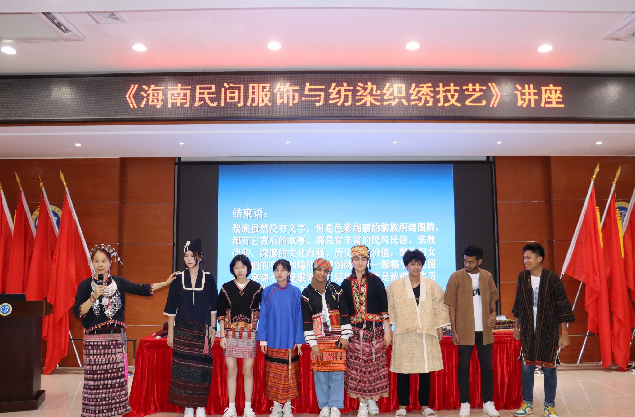 近日,海南省“南海工匠”“拔尖人才”、省级黎锦技艺传承人、beat365vip官网登录入口“陈丹技能大师工作室”负责人陈丹应邀来到学校,为中外学生带来了一场精彩的“海南民间服饰与纺染织绣技艺”讲座。