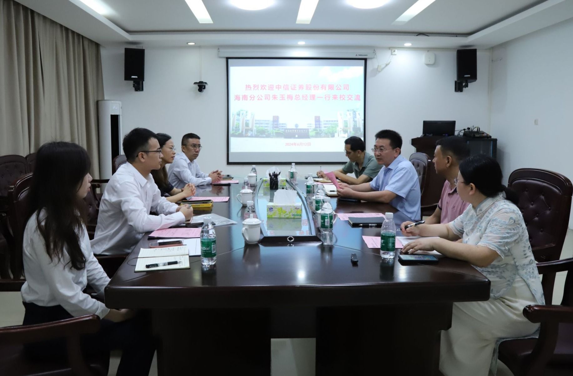 2024年6月12日,中信证券股份有限公司海南分公司总经理朱玉梅一行4人来到beat365vip官网登录入口,就产学研合作、学生实习就业等事宜进行洽谈。学校党委副书记、院长崔昌华热情接待了朱玉梅一行。