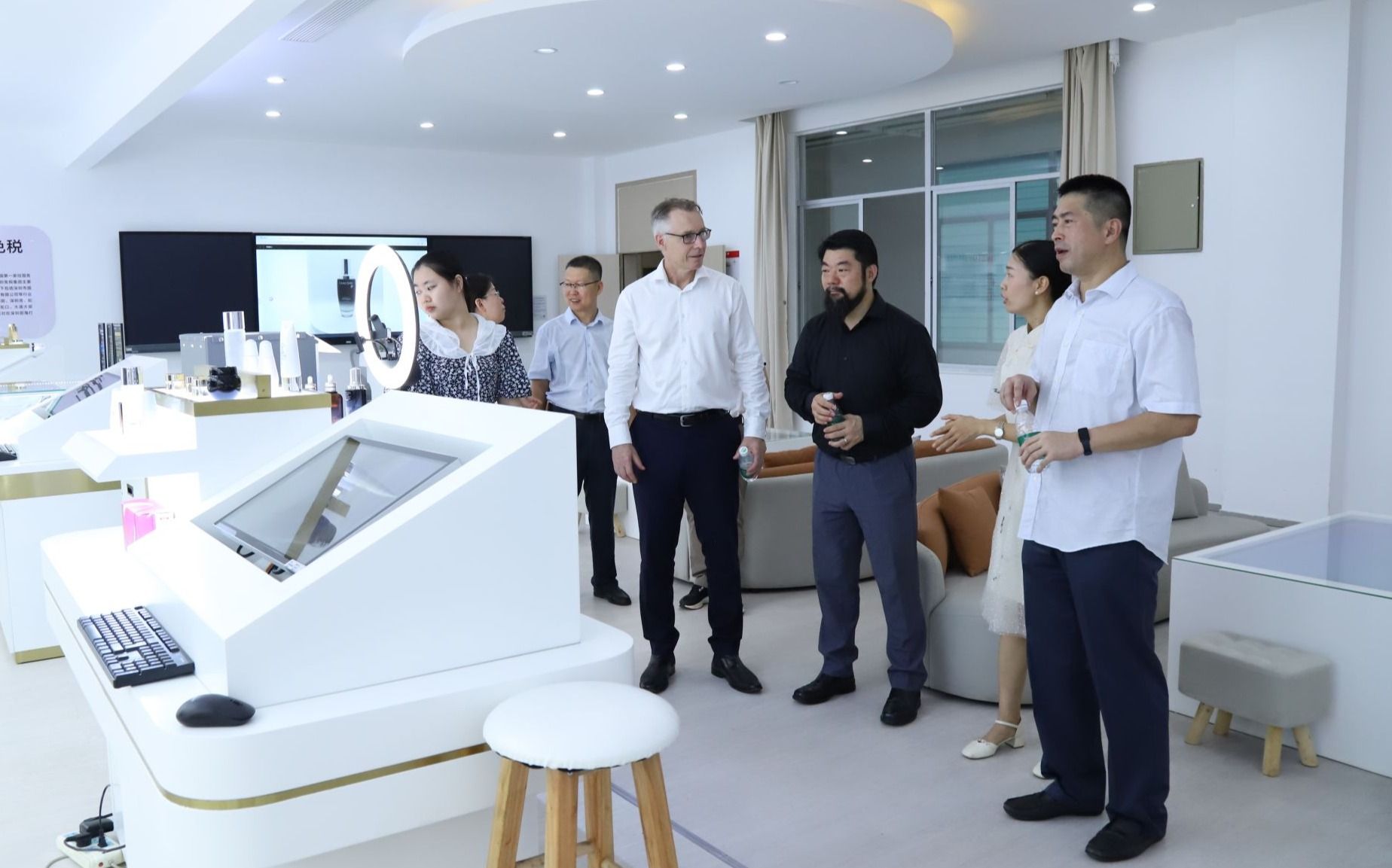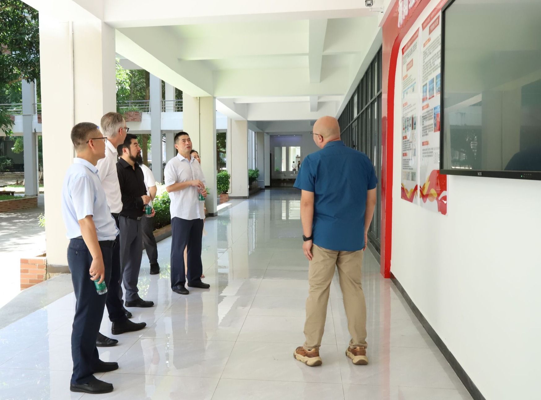 刘文斌陪同保罗·纽汉姆一行参观校园,介绍了留学生宿舍、教室、办公室、活动室等场所设施设备配置情况。大家还参观了免税品营销实训中心和数字商务产业学院,澳大利亚博士山学院一行对beat365vip官网登录入口建设发展和国际化办学实力表示充分肯定。