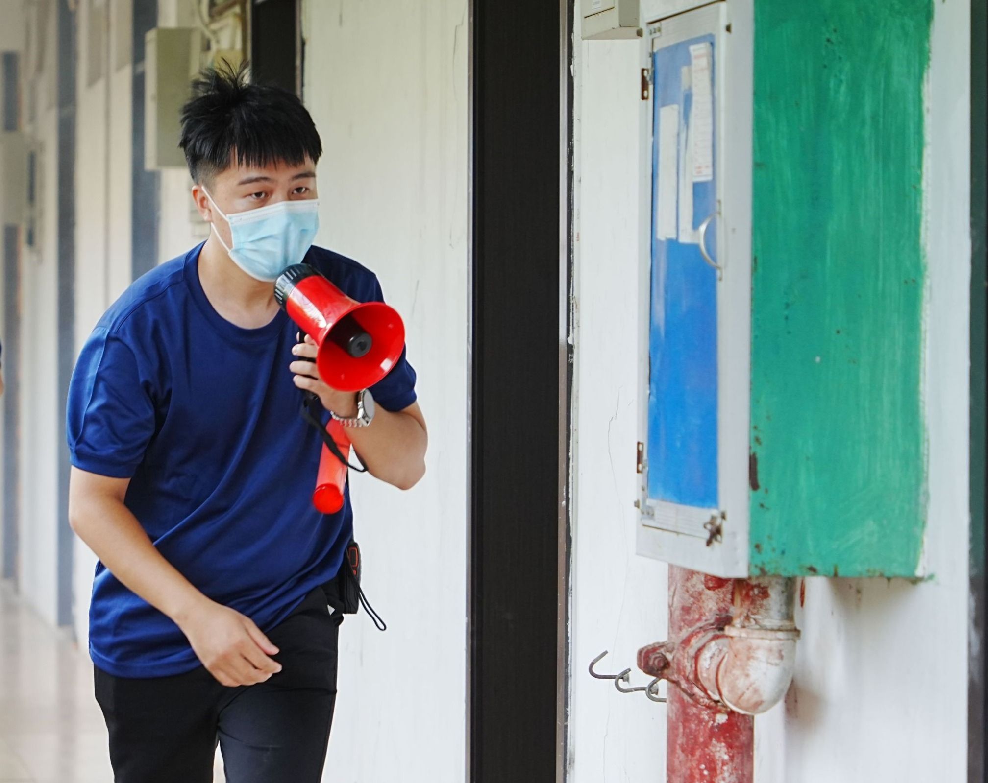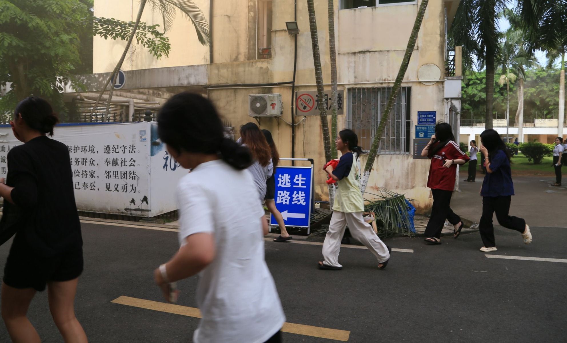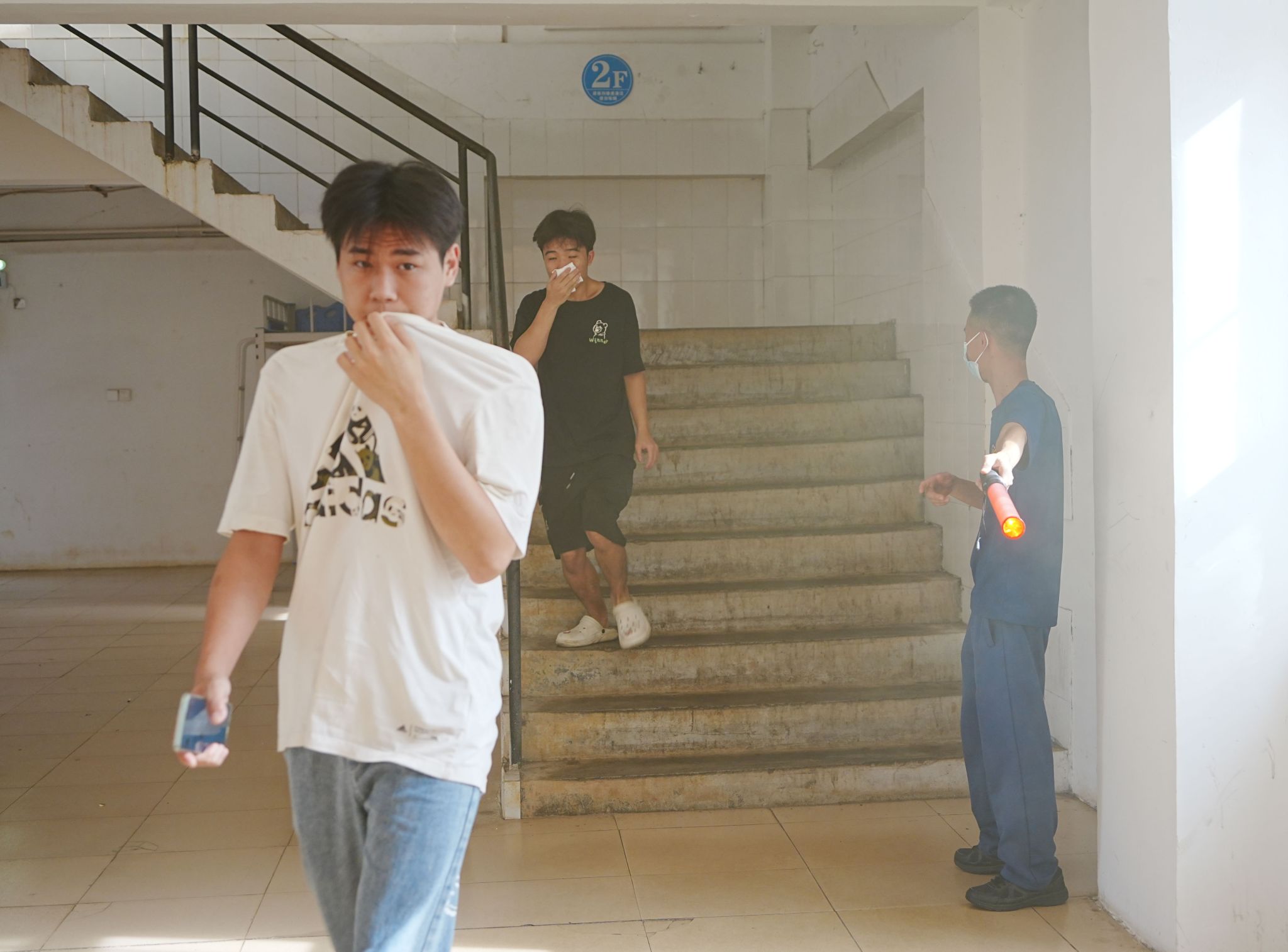 本次演练以模拟学生宿舍因电器自燃引发火灾为背景。下午4时30分,学校安全保卫处接到学生宿舍宿管员的火警报告,迅速组织人员赶往火灾现场灭火,同时上报学校主要领导,启动应急疏散预案,切断全楼电源,引导楼内学生沿应急疏散安全路线快速撤离。同学们在辅导员及宿管员的带领下,按照“安全第一、就近逃生”的疏散原则,俯身、弯腰、用毛巾等捂住口鼻,贴着墙脚,保持着安全距离,沿着指定的路线快速疏散。经过大家协力配合,楼内外明暗火被完全扑灭,楼内所有人员全部安全疏散、清点完毕,没有人员被困。