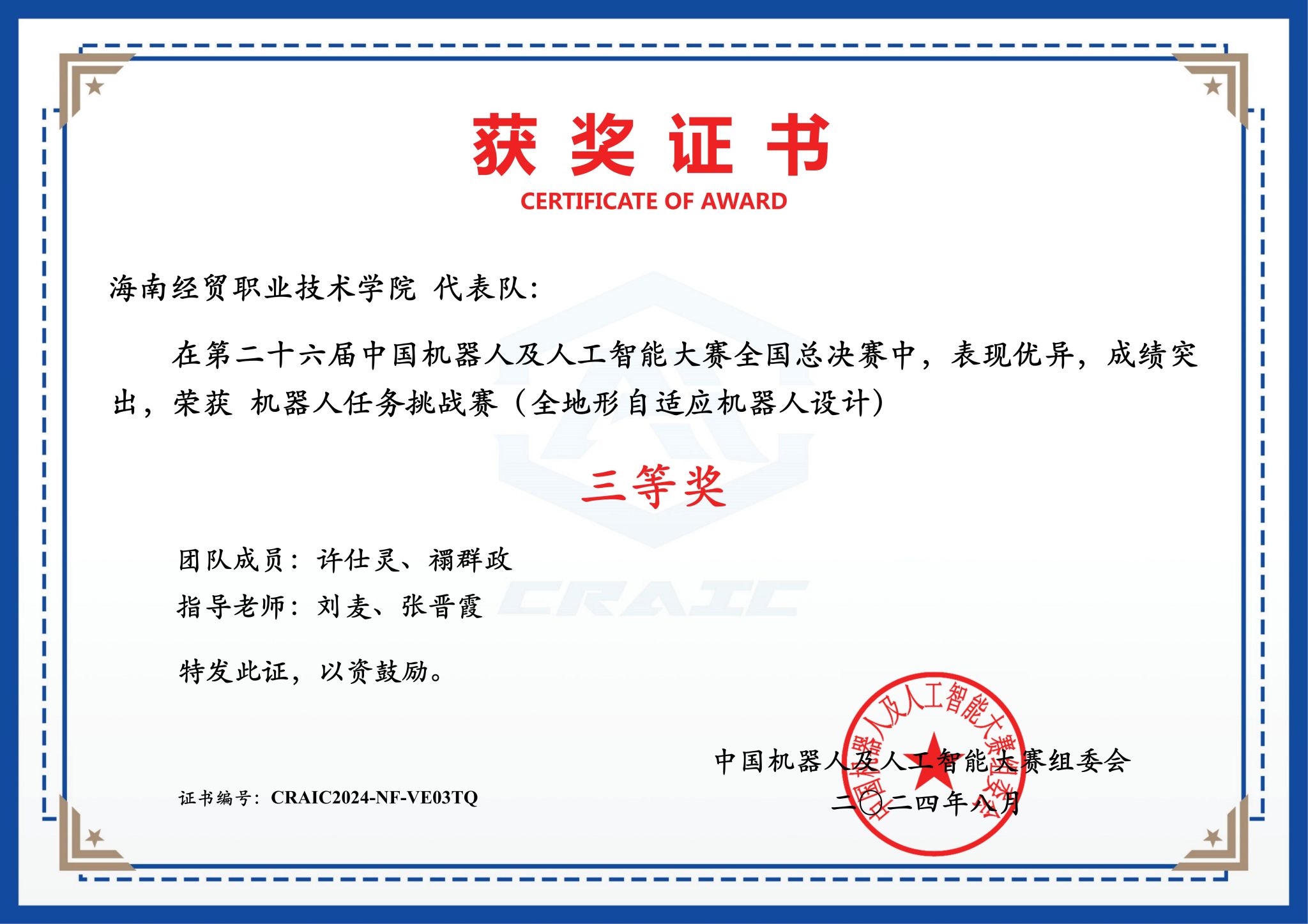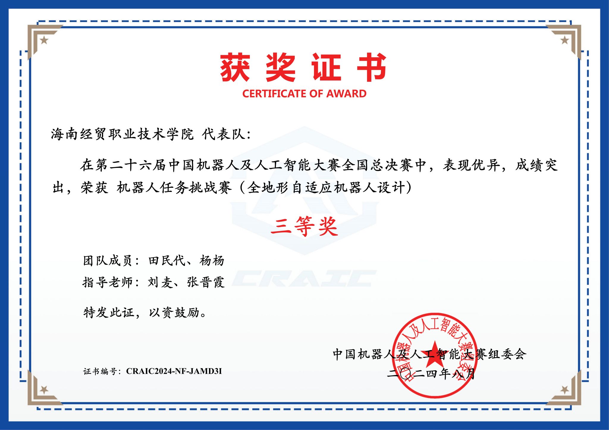 中国机器人及人工智能大赛是一项历史悠久、影响广泛的全国性学科竞赛,目前已为我国培养了大量“能动手、敢创新、善协作”的复合型人才。本届赛事设置“创新、应用、竞技、挑战”四大类别,涉及人形机器人、轮式机器人、多足异形机器人、智慧农业机器人、群体协作机器人等多种形态与应用领域,聚焦前沿技术与产业需求。在全国总决赛中,海经贸参赛选手与来自哈尔滨工业大学、浙江大学、华中科技大学、国防科技大学、北京航空航天大学、北京理工大学、同济大学等208所高校的407支队伍1300余名选手同台竞赛,围绕自动驾驶、机器人及人工智能等领域的前沿技术应用与实践展开激烈竞争,最终取得优异成绩。