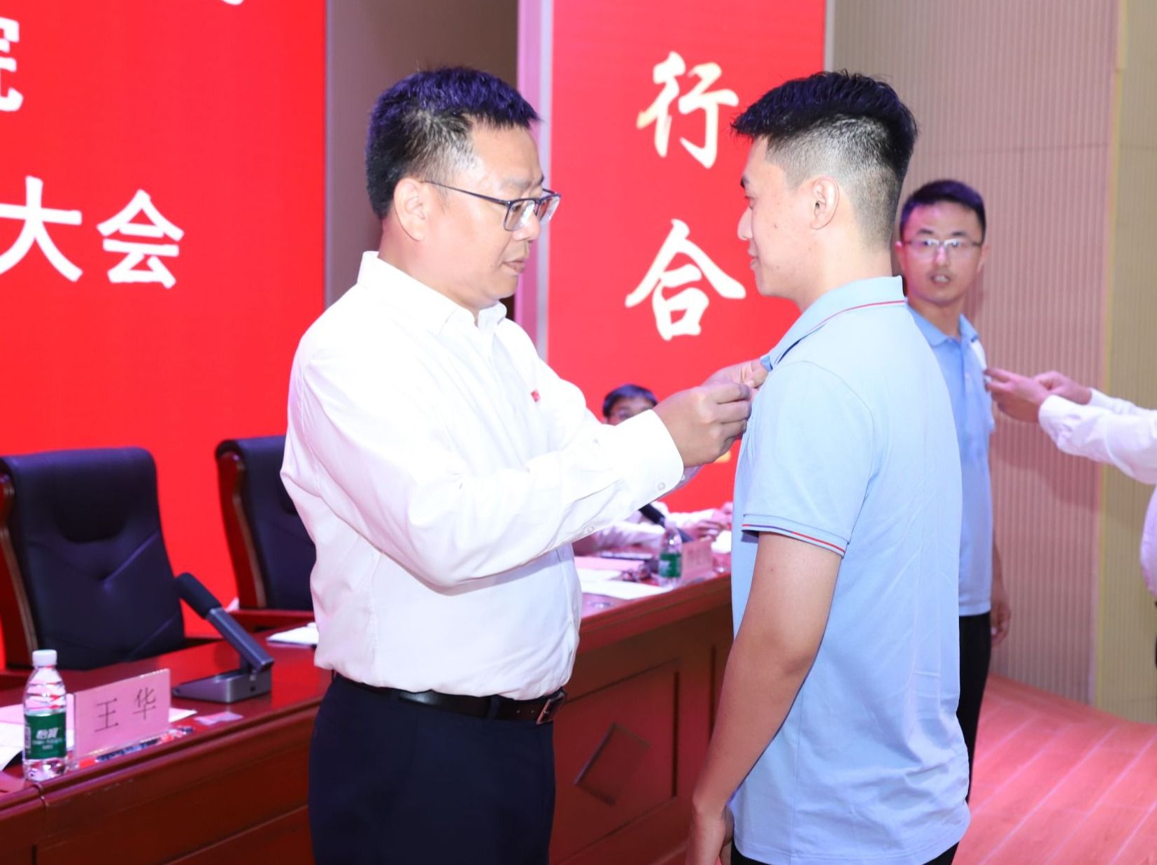 王华书记、崔昌华校长为新入职教师代表佩戴学校徽章