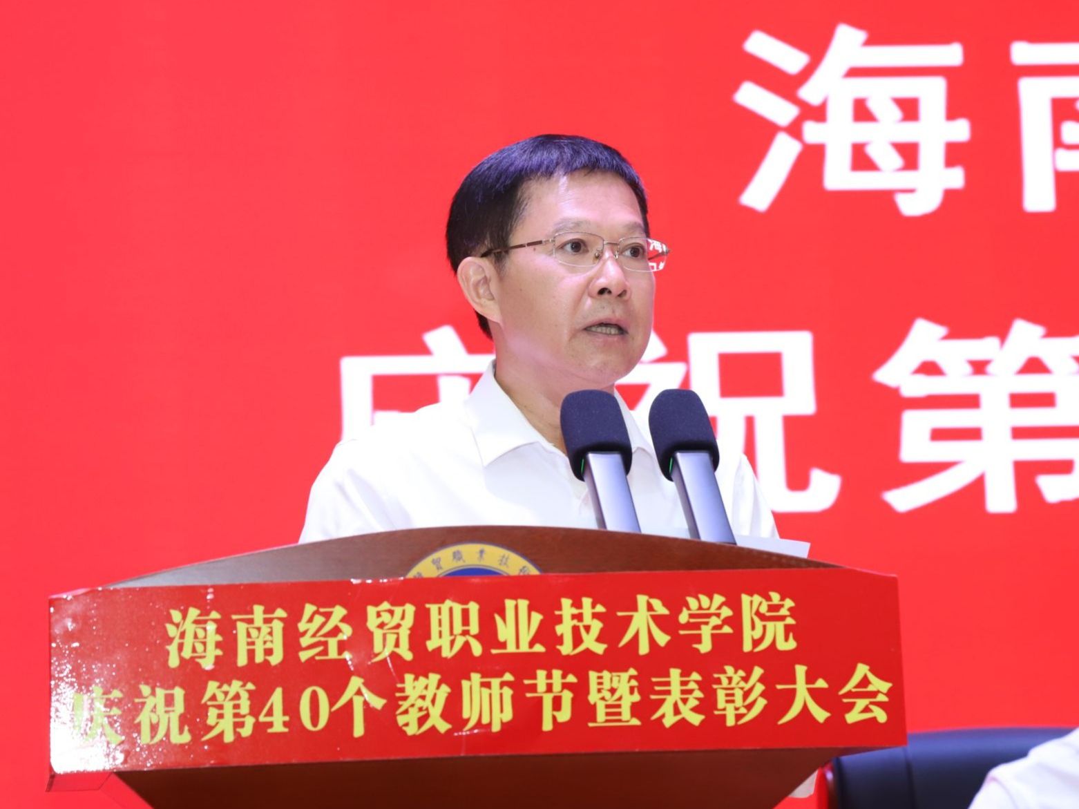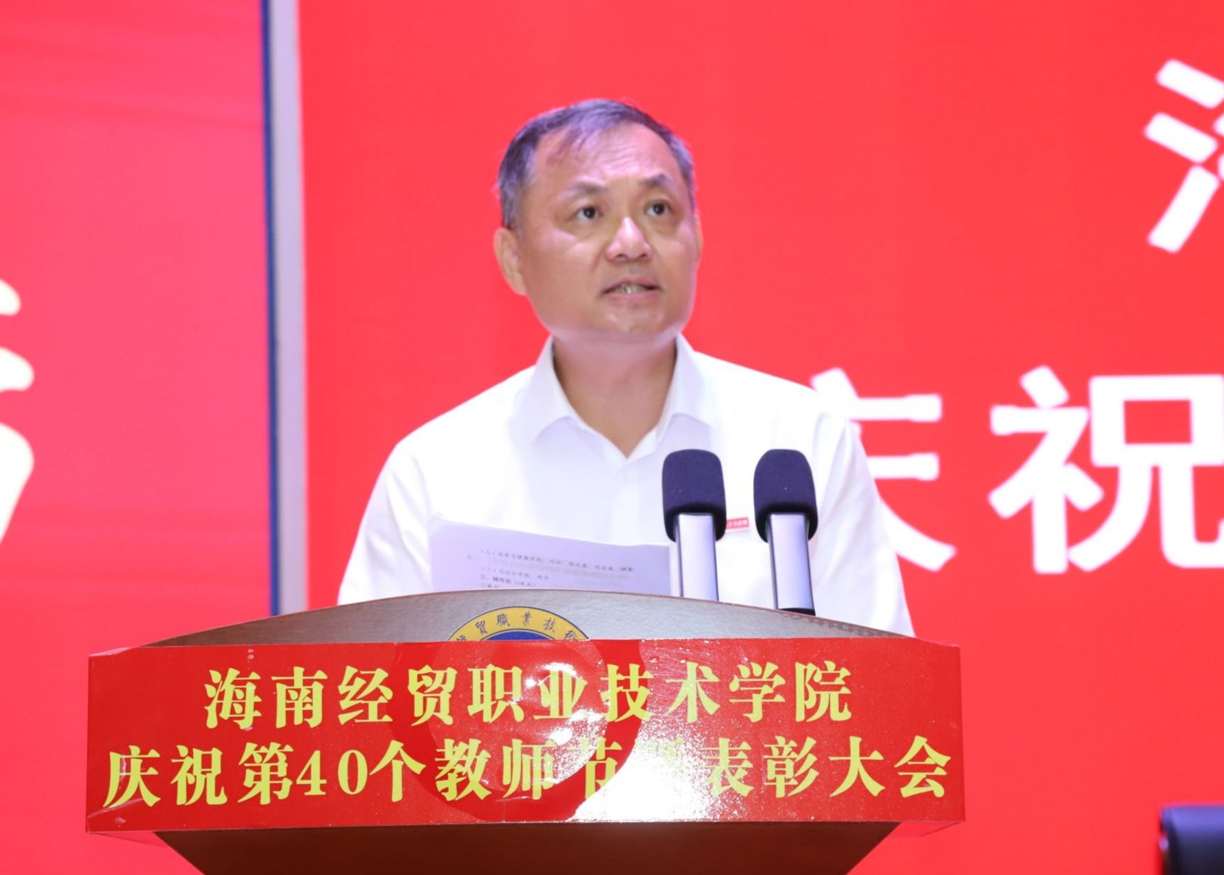 王华代表学校党委,向在防御台风、积极响应灾后重建工作中勇于担当的教职工们致以最诚挚的感谢,向学校全体默默奉献、辛勤工作的老师们致以节日问候,向始终关心支持学校发展的退休教师表示亲切慰问,向光荣退休和从教三十年的教师致以崇高敬意,向获得通报表彰的团队和个人表示热烈祝贺。他回顾了海经贸光辉的办学历程并表示,学校成绩的取得来之不易,实现高质量发展依然面临着考验挑战,需要全体海经贸人攻坚克难、接续奋斗。