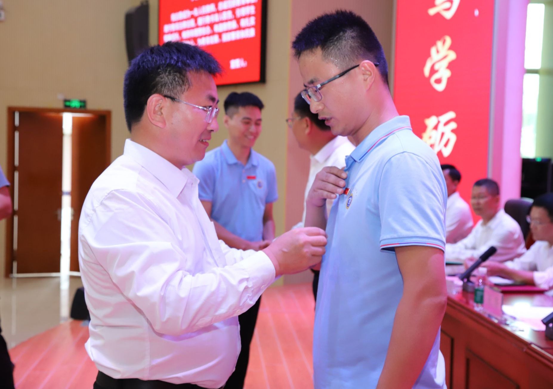 在庄严的国歌声中,大会正式拉开帷幕。王华、崔昌华为新入职教师代表佩戴学校徽章。在学校党政班子的监誓下,全体新入职教师在马克思主义学院教授马桂琴的领誓下郑重宣誓,眼神中闪烁着对教育事业的无限热爱与坚定承诺。