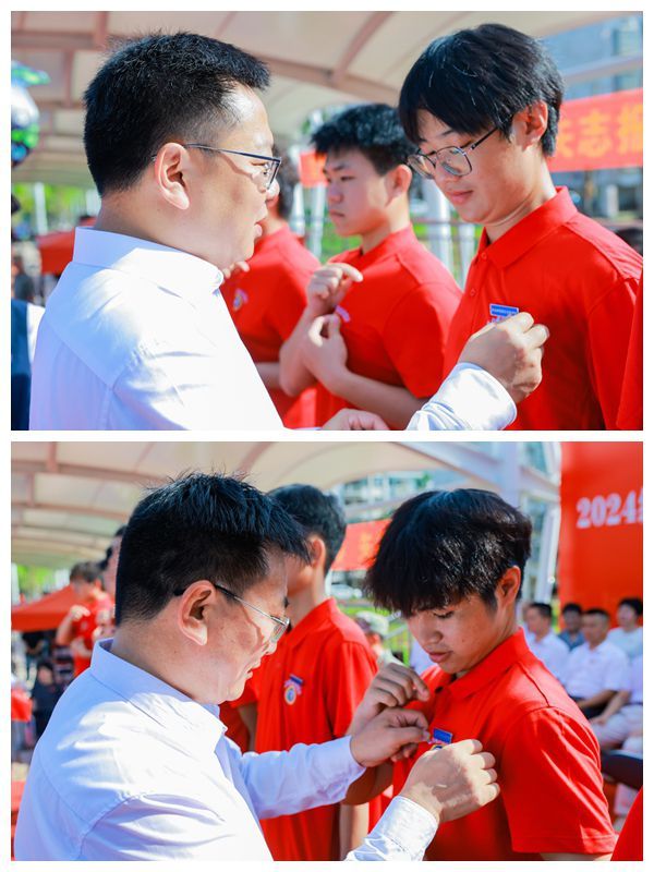 典礼上,王华、崔昌华为新生代表佩戴学校徽章。徽章熠熠生辉,承载着“笃学砺能、知行合一”的校训精神,见证着新一代海经贸学子开启他们的梦想之旅,勇往直前,迈向光明未来。