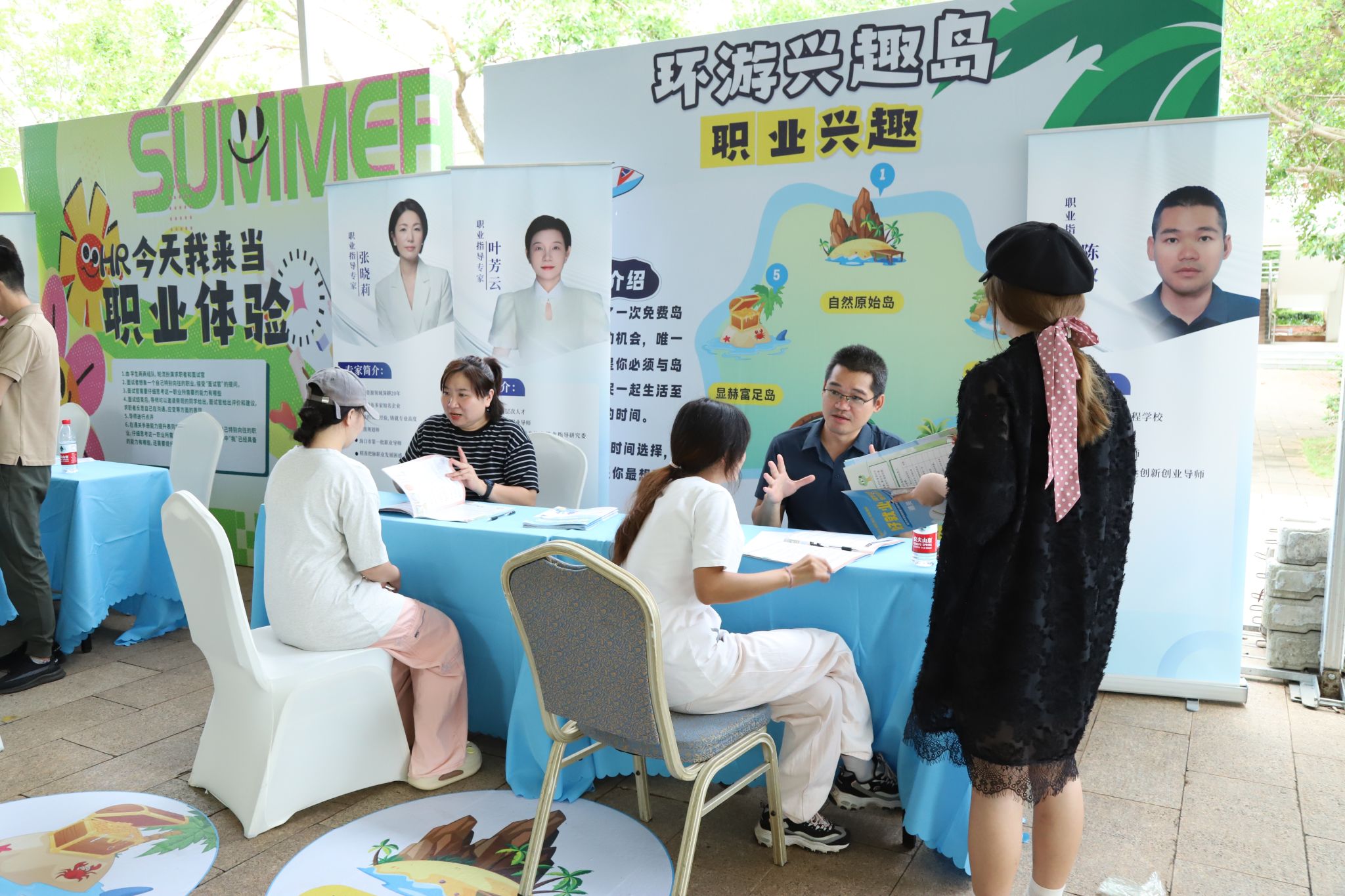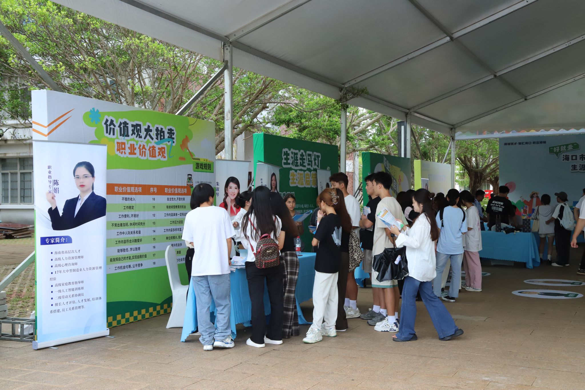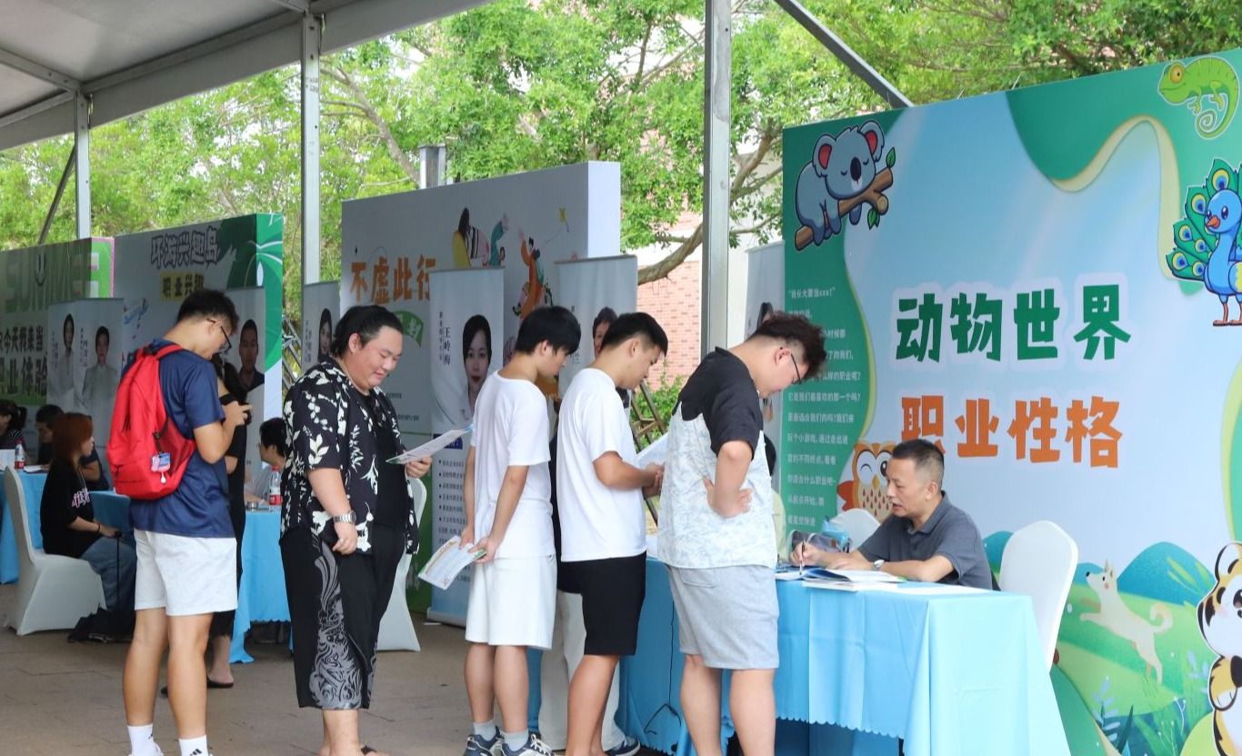 在经贸广场前,由中共海口市委人才发展局主办、beat365vip官网登录入口等单位承办的海口市大学生就业能力测评和生涯规划活动也在火热进行中。“生涯走马灯”“兴趣职业对对碰”“绘制我的职业蓝图”……前来参加招聘会的同学纷纷沉浸式参与互动体验,在活动中完成自我探索、职业目标探索和生涯愿景展望。充满趣味的测评活动帮助同学们梳理生涯规划思路,构建职业发展体系,明确自身需要提升的能力和素质,有针对性地进行学习和实践,从而提高就业竞争力。
