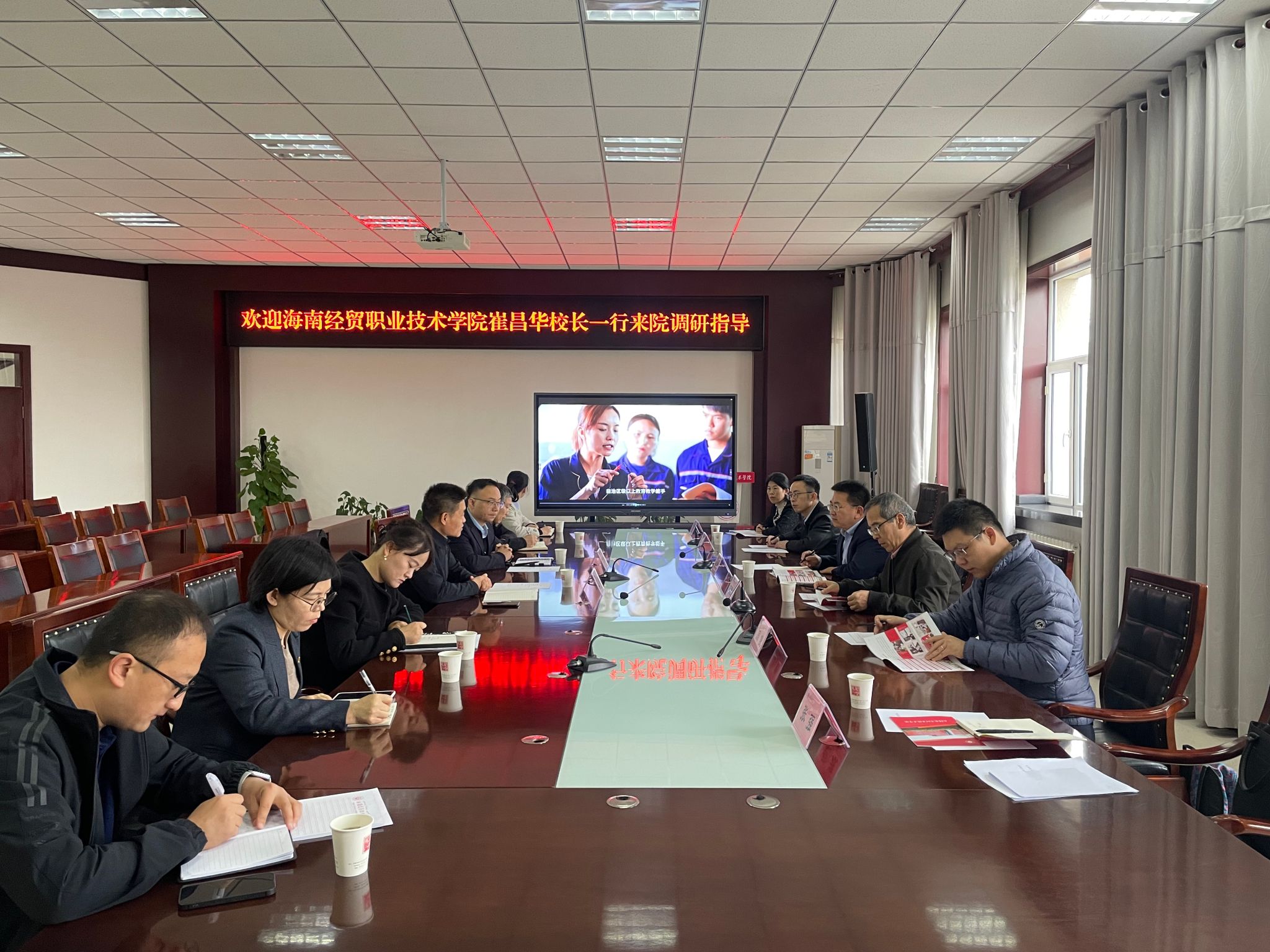 崔昌华从建校历史、学科专业、人才培养、国际交流、“双高”建设等方面介绍了学校的基本情况。他说,新疆交通职业技术学院在推进职业教育高质量发展过程中,抢抓政策机遇,实现资源整合,在办学治校方面取得显著成效,这些成功经验为海经贸提供了学习和借鉴的宝贵范例。双方作为西部边疆地区高职院校高质量发展联盟成员院校,应深入加强交流合作,积极参与和融入共建“一带一路”,扩大西部边疆地区高水平开放。