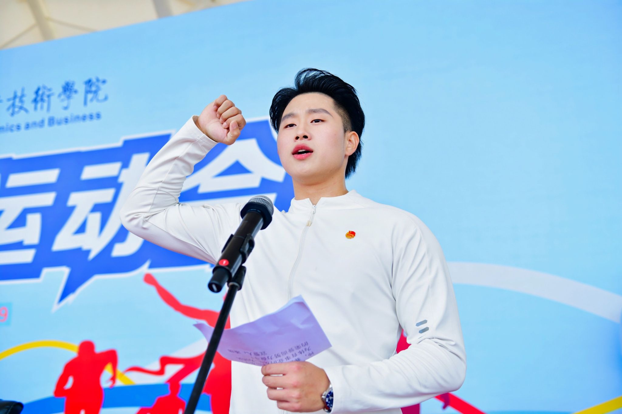 崔昌华代表学校向运动会的顺利召开表示热烈祝贺,向参加各项赛事的运动健儿们致以亲切的问候。他说,体育强则中国强,国运兴则体育兴,扎实做好大学生体育运动实践工作,是落实体育强国、健康中国战略的关键举措。校运会是学校的一项传统体育赛事,是丰富校园文化生活的重要载体。他希望海经贸师生在运动会上投入饱满的态度和昂扬的斗志,赛出成绩、赛出水平、赛出风格,把体育场上顽强拼搏、挥汗如雨的模样转化为“我将无我、不负韶华”的拼搏之志;希望全体裁判员、工作人员公平裁判,把爱心献给师生,把责任心献给大会,以一流的竞赛组织和服务保障,把本届运动会办成标准高、效果好、影响深的体育盛会,充分展现海经贸师生风采,取得运动成绩和精神文明的双丰收。