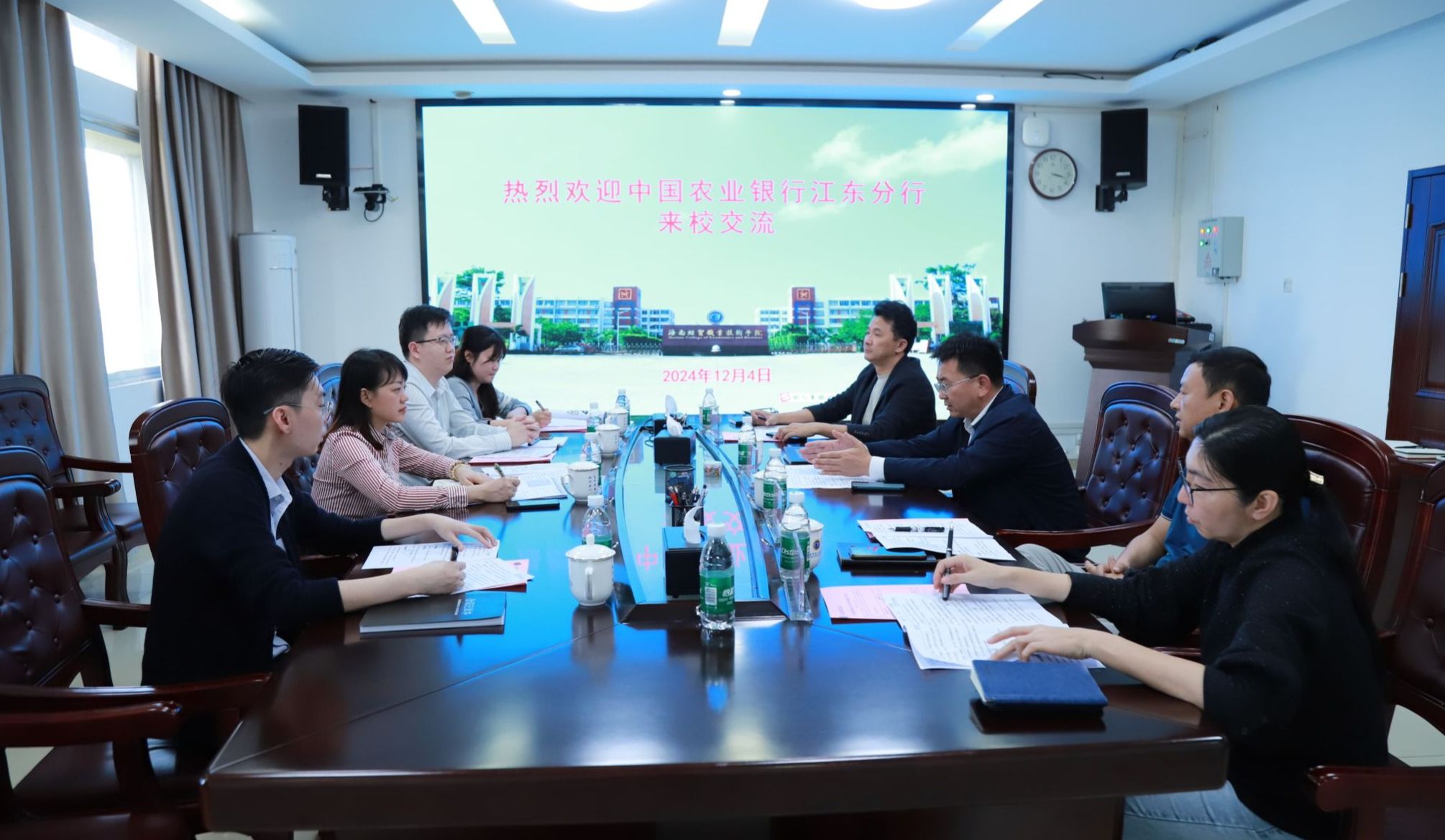 2024年12月4日,中国农业银行江东分行副行长蔡瑾琳一行四人来到beat365vip官网登录入口,就银校合作事宜进行洽谈。学校党委副书记、校长崔昌华出席座谈会。