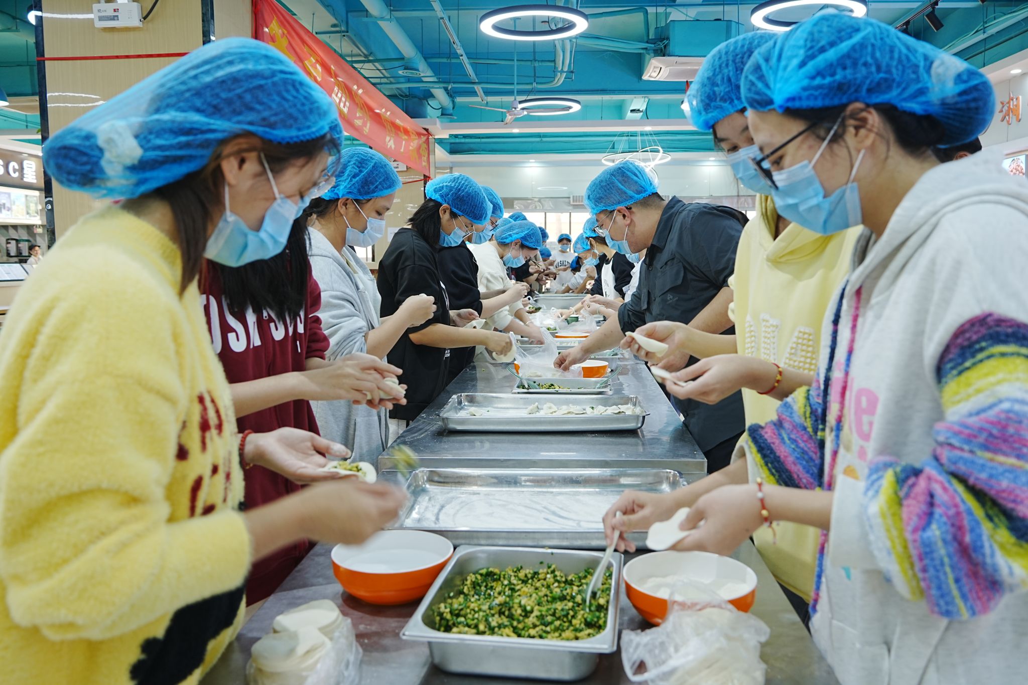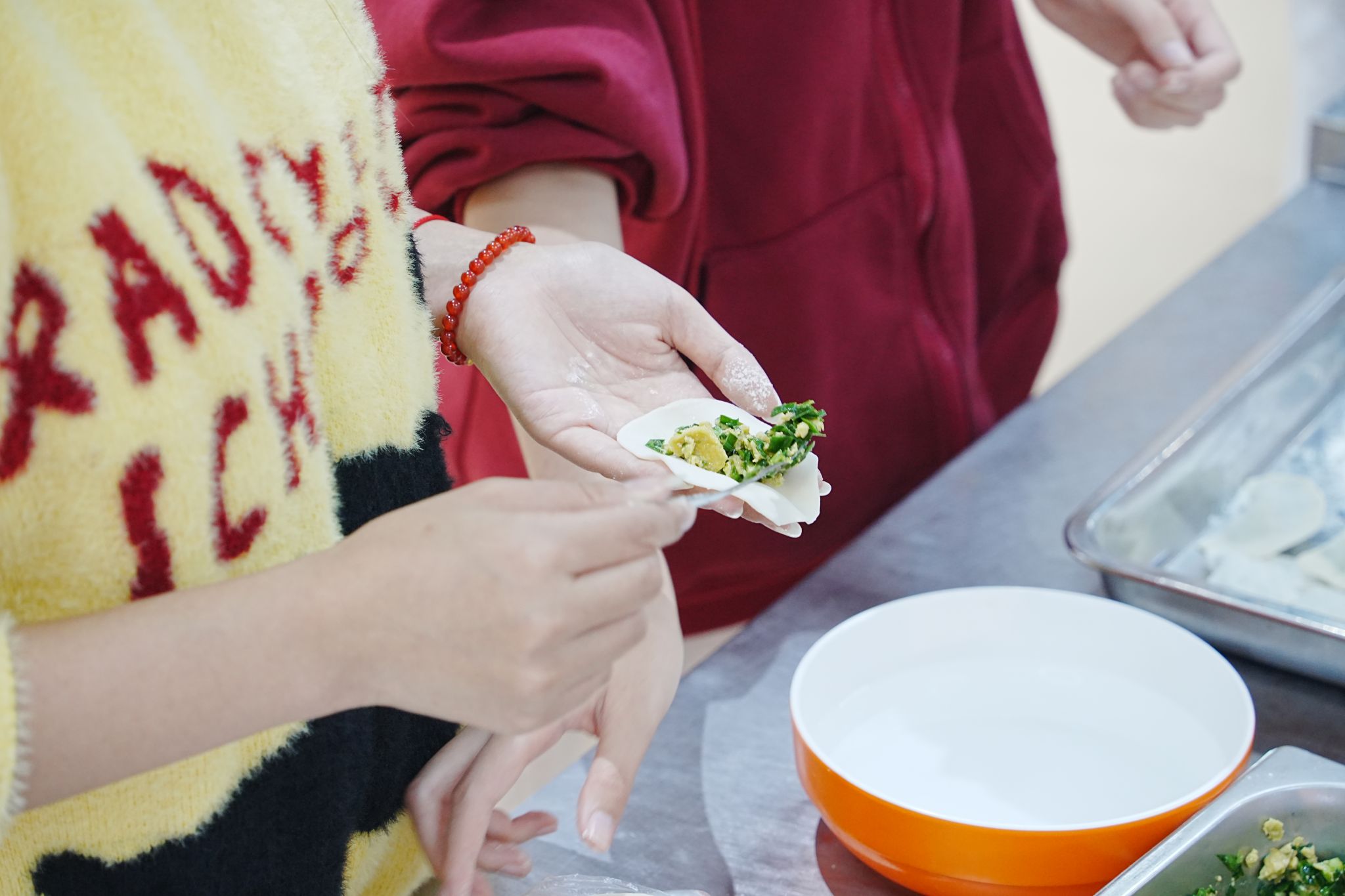 活动现场,师生代表们在食堂工作人员的精心指导下,摩拳擦掌准备大展拳脚。面皮的香气和馅料的鲜香交织在一起,师生们默契配合,边包边聊,现场充满了欢声笑语。饺子的形状千奇百怪,各具特色的饺子同时出现在一个面板上,就好比来自五湖四海的同学们,在海经贸相遇。