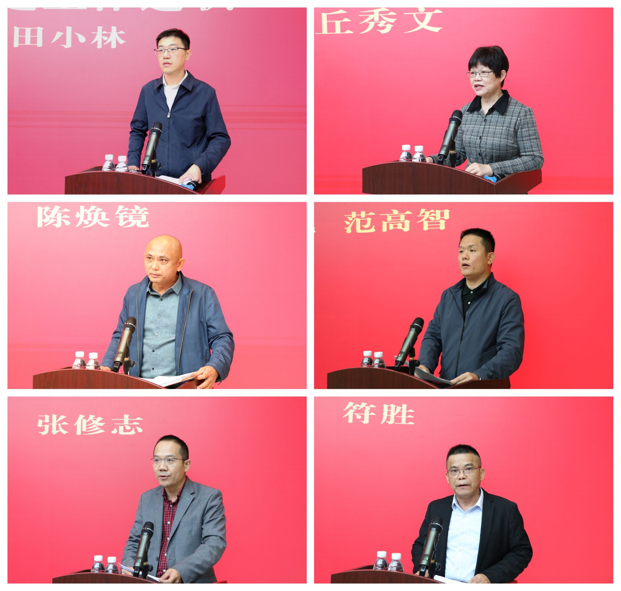 机关党总支书记田小林、教辅党总支书记丘秀文、马克思主义学院党总支书记陈焕镜、财务管理学院党总支书记范高智、国际贸易学院党总支书记张修志、信息技术学院党总支书记符胜作2024年抓基层党建工作述职