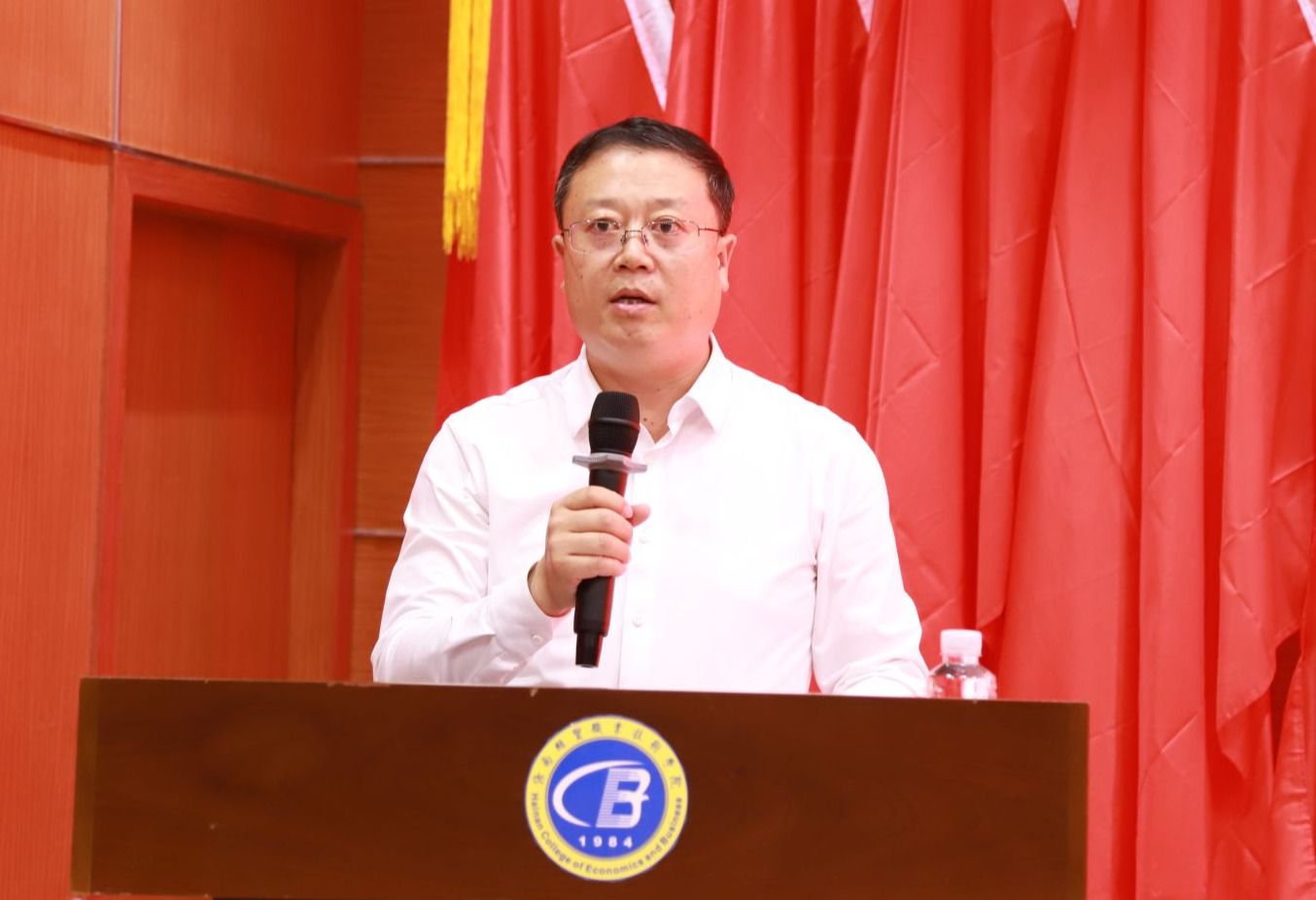 开学典礼在庄严的国歌声中拉开帷幕。李厚永代表学校向同学们追求知识、积极进取的精神表示诚挚的敬意。他介绍了学校的基本情况和近年来发展建设取得的成绩,勉励同学们珍惜学习机会,全面提升个人能力和素质。针对同学们的学习生活,他提出三点建议。一是坚定信念,争做心有所向的追梦者,努力学习新业务,掌握新知识,练就新本领。二是锤炼本领,争做学有所得的内行人,不断开阔视野眼界,更新思想观念。三是学以致用,争做业有所成的实干家,立足岗位,勤学苦练,踏实肯干,努力在海南自贸港建设的大舞台上成就梦想。