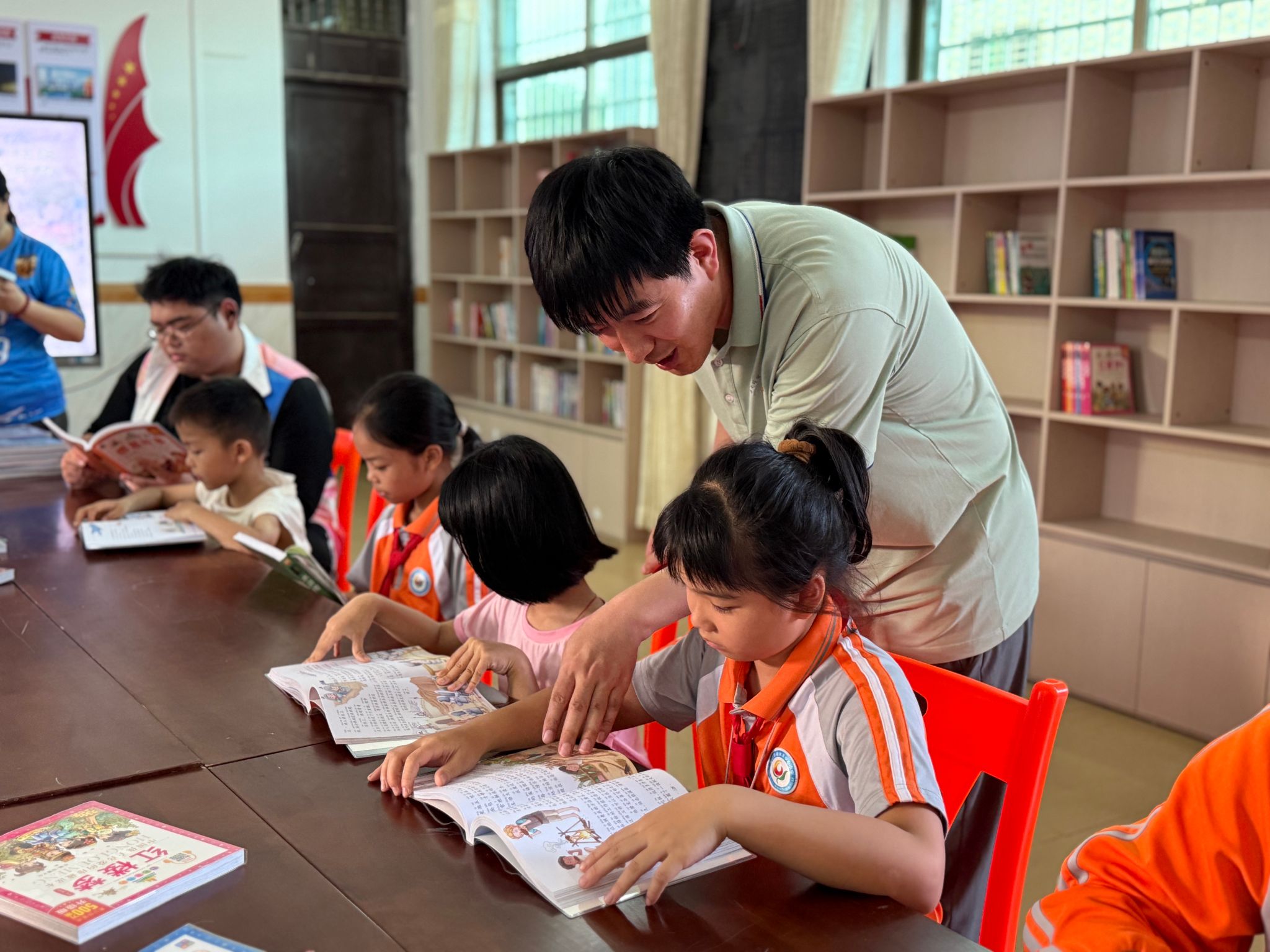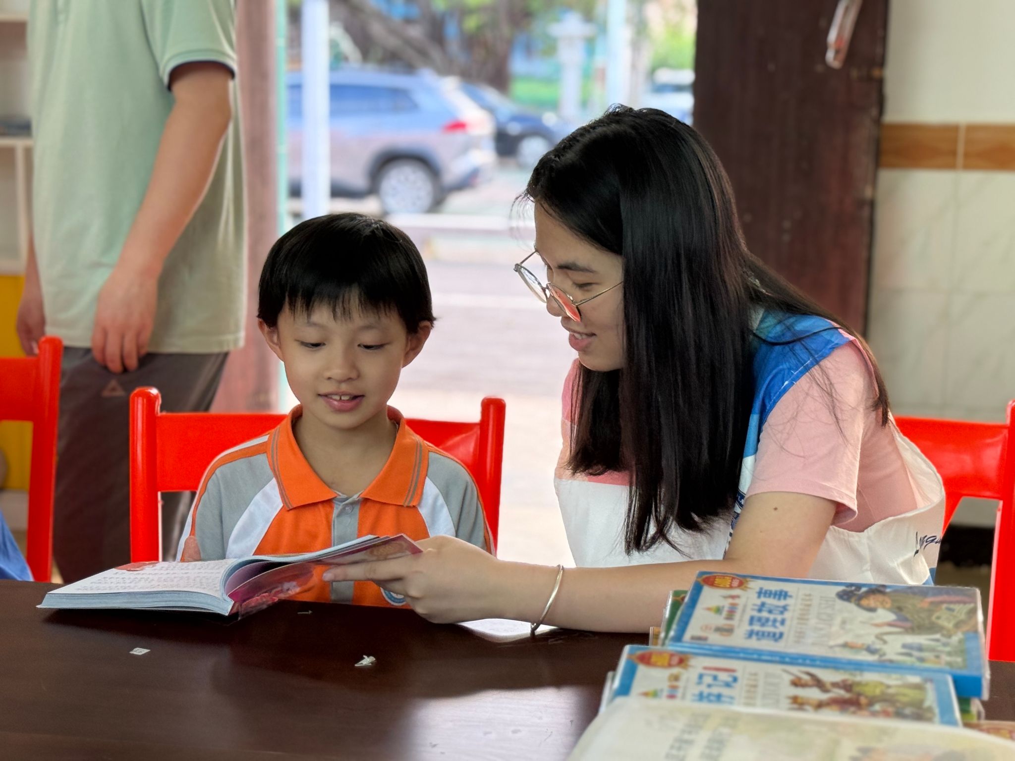 海经贸向迈进社区捐赠儿童图书。书籍涵盖经典童话故事、中国历史百科、常见知识科普等类别。外国语学院学生党员志愿者声情并茂地带领孩子们阅读书籍,分享童话故事,给孩子们送去一份有意义的六一儿童节礼物,在他们心中播撒“知识之种”。孩子们阅读书籍,脸上绽放出幸福的笑容。