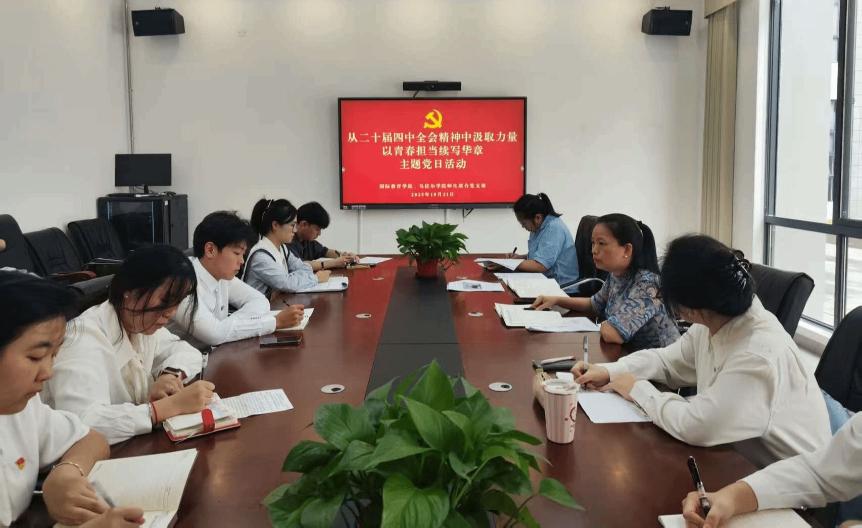 2025年10月31日,国际教育学院、乌拉尔学院师生联合党支部组织开展“从党的二十届四中全会精神中汲取力量,以青春担当续写华章”主题党日活动暨入党积极分子座谈会,深入学习贯彻党的二十届四中全会精神,引导青年党员将个人理想融入国家发展大局。师生党员和入党积极分子齐聚一堂,在思想碰撞中明晰目标,在精神传承中凝聚力量。