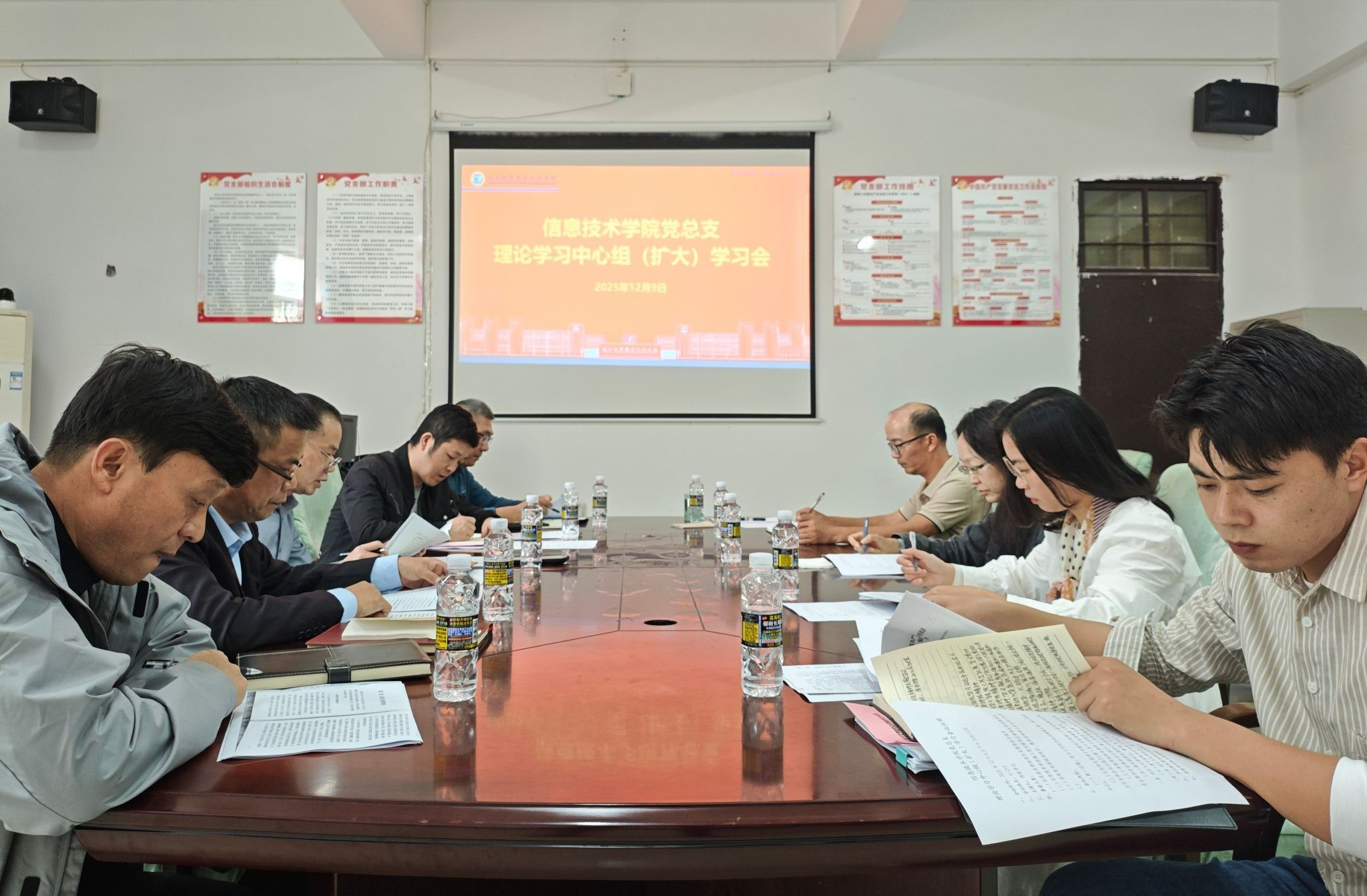 2025年12月9日,信息技术学院党总支召开理论学习中心组(扩大)学习会,深入学习《习近平法治思想学习纲要》相关篇章、党的二十届四中全会报告和《中国共产党纪律处分条例》第二章等内容,结合学院发展实际研讨落实举措。