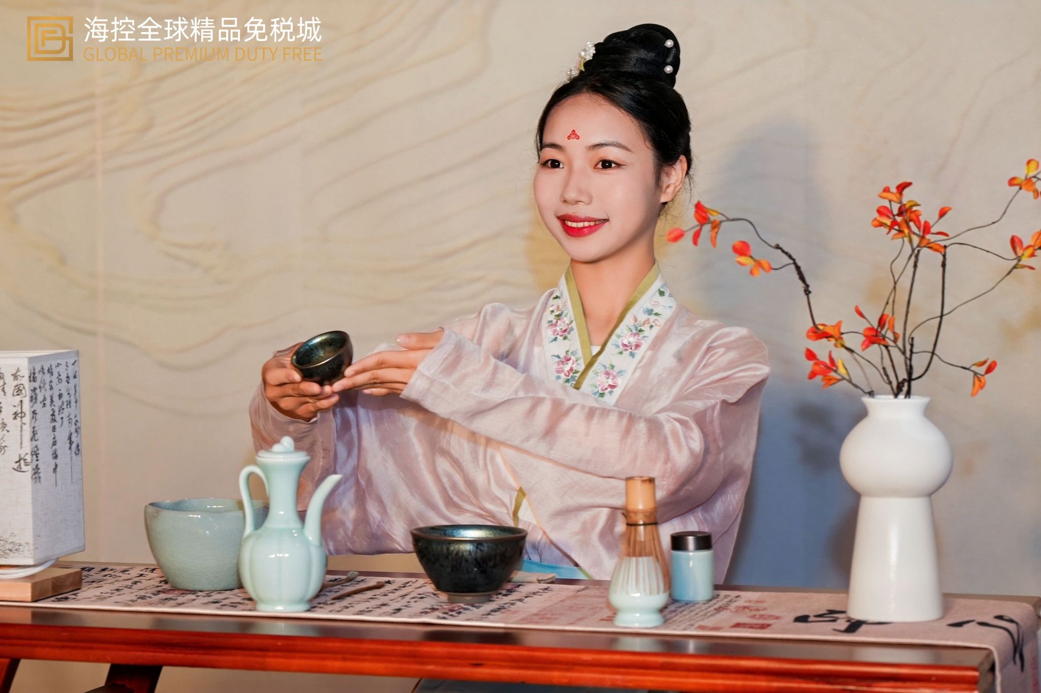 宋韵点茶展风采,校企协同育新人。近日,海口日月广场海控全球精品免税城“诗酒趁年华 烟火映万家”东坡主题活动顺利举办。beat365vip官网登录入口国际旅游学院茶艺老师林文超带领肖佳、黄少雨、祝雅兰、吴钟圣四名学生,携手校企合作单位华闻雨林润红公司,在活动现场呈现了一场韵味十足的宋代点茶表演。