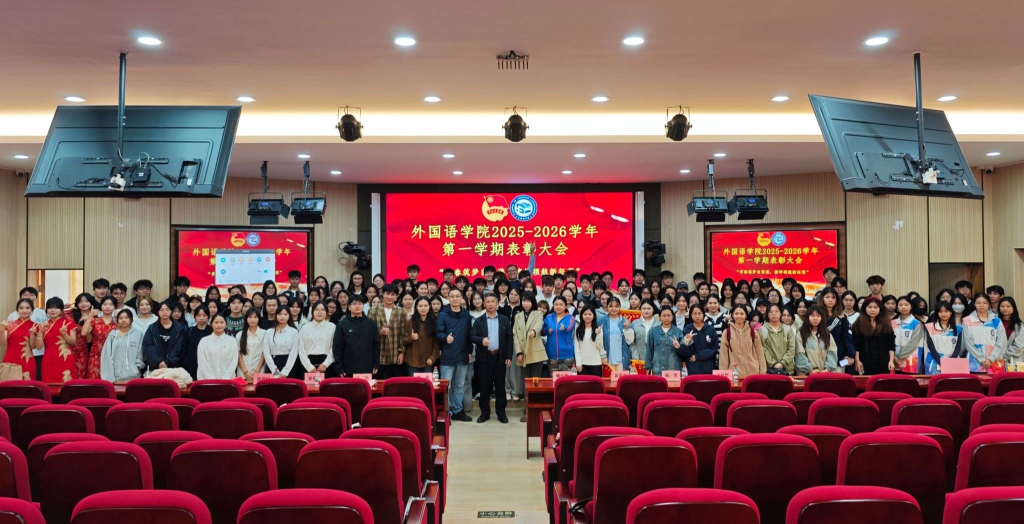 近日,外国语学院举行2025-2026学年举行第一学期表彰大会。此次表彰覆盖星级宿舍建设、文体活动、志愿服务、学生工作等多个维度,全院师生齐聚一堂,共赴这场荣誉盛典,让奋斗火种在青春校园里接力传递。150余名学生代表参加大会。