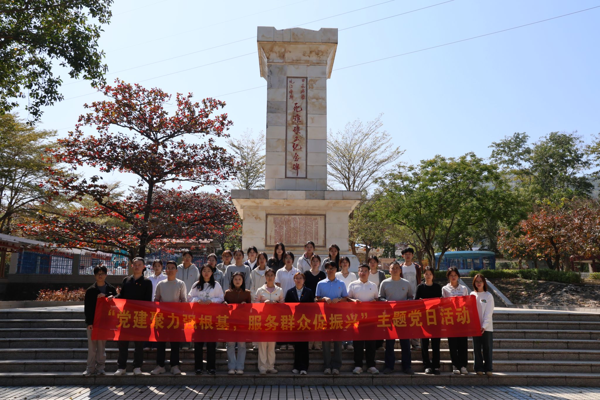 在昌江矿山公园死难矿工纪念碑前,全体党员整齐列队,肃立默哀,向死难矿工敬献菊花,表达深切哀思与崇高敬意。随后,学院党总支副书记李琰现场讲授了“铭记历史 开创未来”为主题的专题微党课。党课通过讲述矿工们在黑暗岁月中遭受的苦难、展现的不屈意志以及在中国共产党领导下奋起抗争的英勇事迹,让现场党员同志们沉浸式感受到这段浸血的历史不仅是民族伤痛记忆,更是爱国主义教育的生动教材。