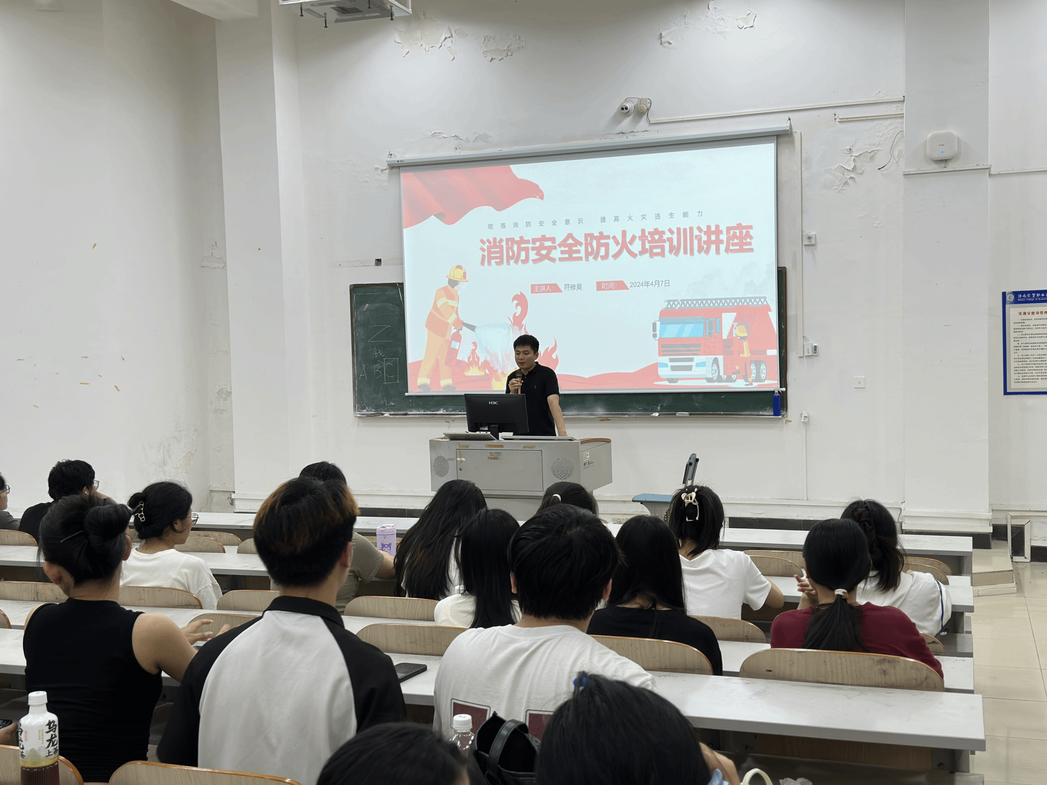 近日,人文艺术学院开展消防安全知识讲座。学工办副主任徐超、辅导员符修昊分别从高校火灾事故的主要类型、扑灭火灾的有关技能、火场逃生自救的方法、火灾事故的预防等四个内容进行讲解,结合大量案例资料提醒同学们预防火灾的重要性,叮嘱大家将消防安全知识内化于心、外化于行,共同做好火灾防范工作。