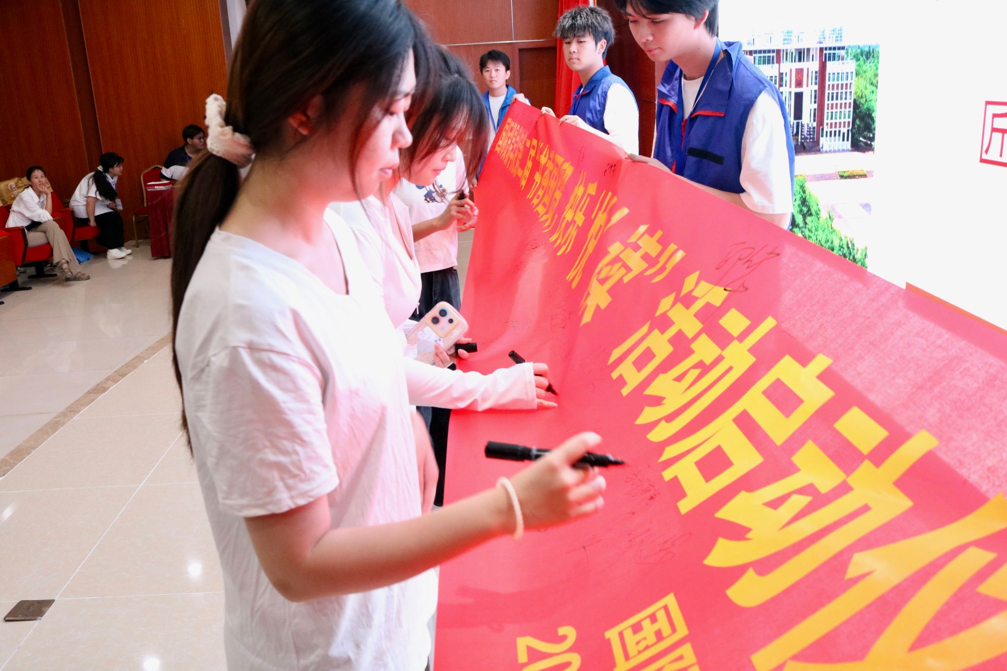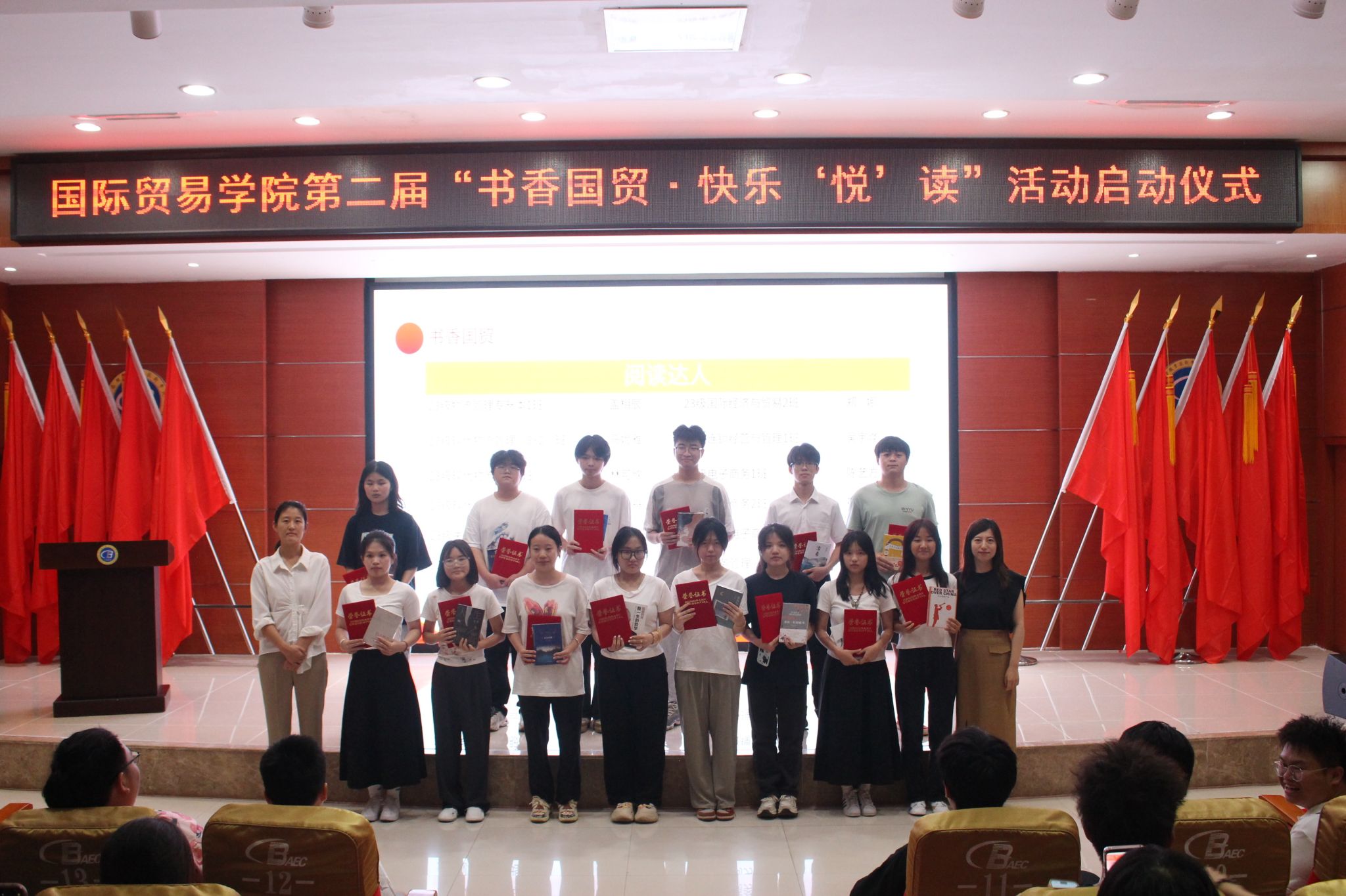 启动仪式上,学院为第一届5个“书香班级”和14位“阅读达人”颁发荣誉证书,为第二届“阅读推广人”颁发聘书。在场的同学们参与“书海盲盒”抽奖,学生代表宣读倡议书,2023级物流专升本1班同学现场诗朗诵《我爱读书》,精彩的互动和表演将现场气氛推向高潮。师生代表们纷纷在横幅上签名,积极参与“书香国贸”建设。