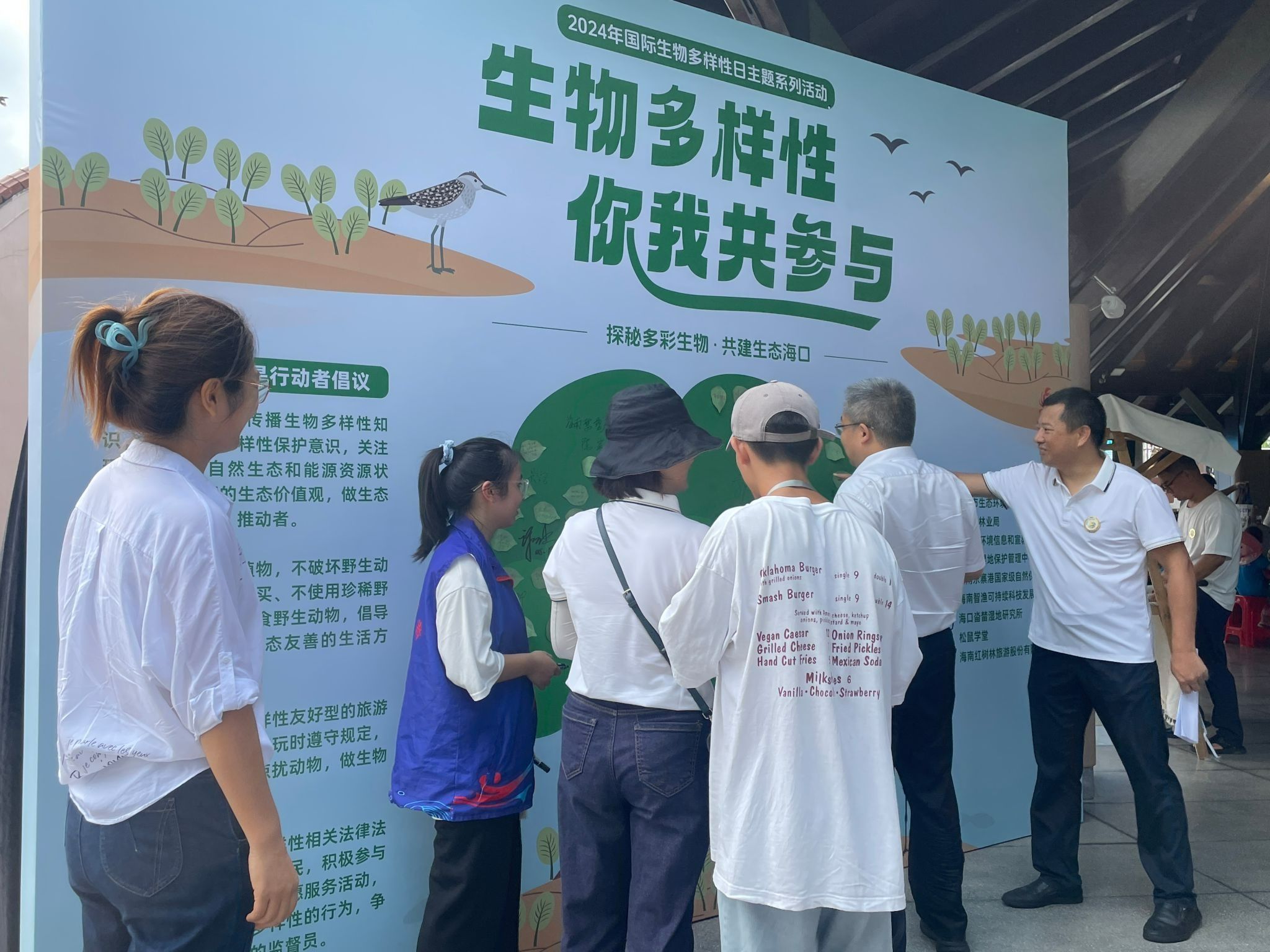 志愿者们根据分工安排,积极引导相关部门的领导嘉宾在签名墙前签字并有序入座,协助做好科普讲座互动礼品发放。志愿者们积极协助美丽海口生物多样性科普展、生物万花筒科普市集、亲子自然观察笔记和“你描述我猜鸟”等活动开展,在各活动现场引导并协助游客参与各种互动游戏和科普活动,让游客们进一步了解和认识红树林生态系统,增强参与生物多样性保护的意识,让生态文明理念更加深入人心。