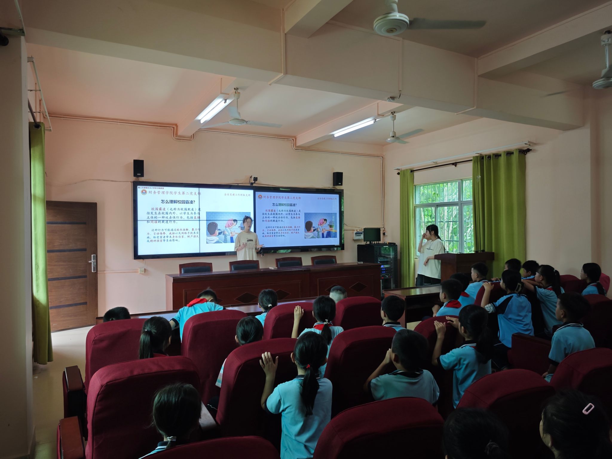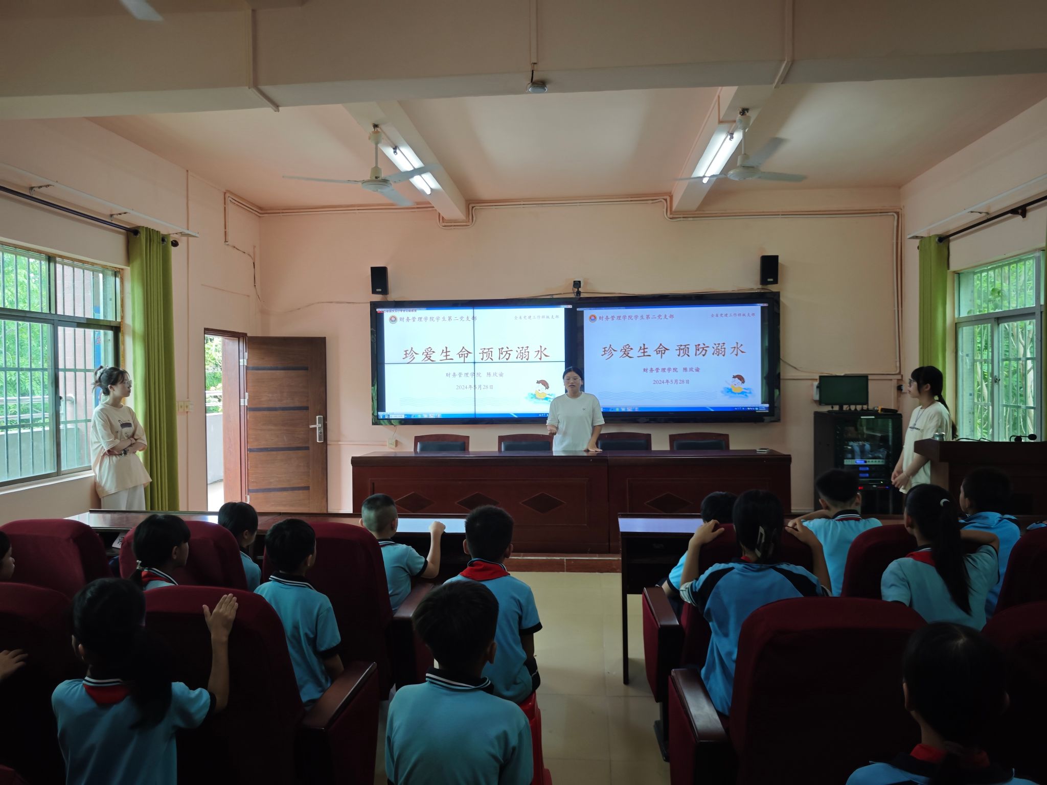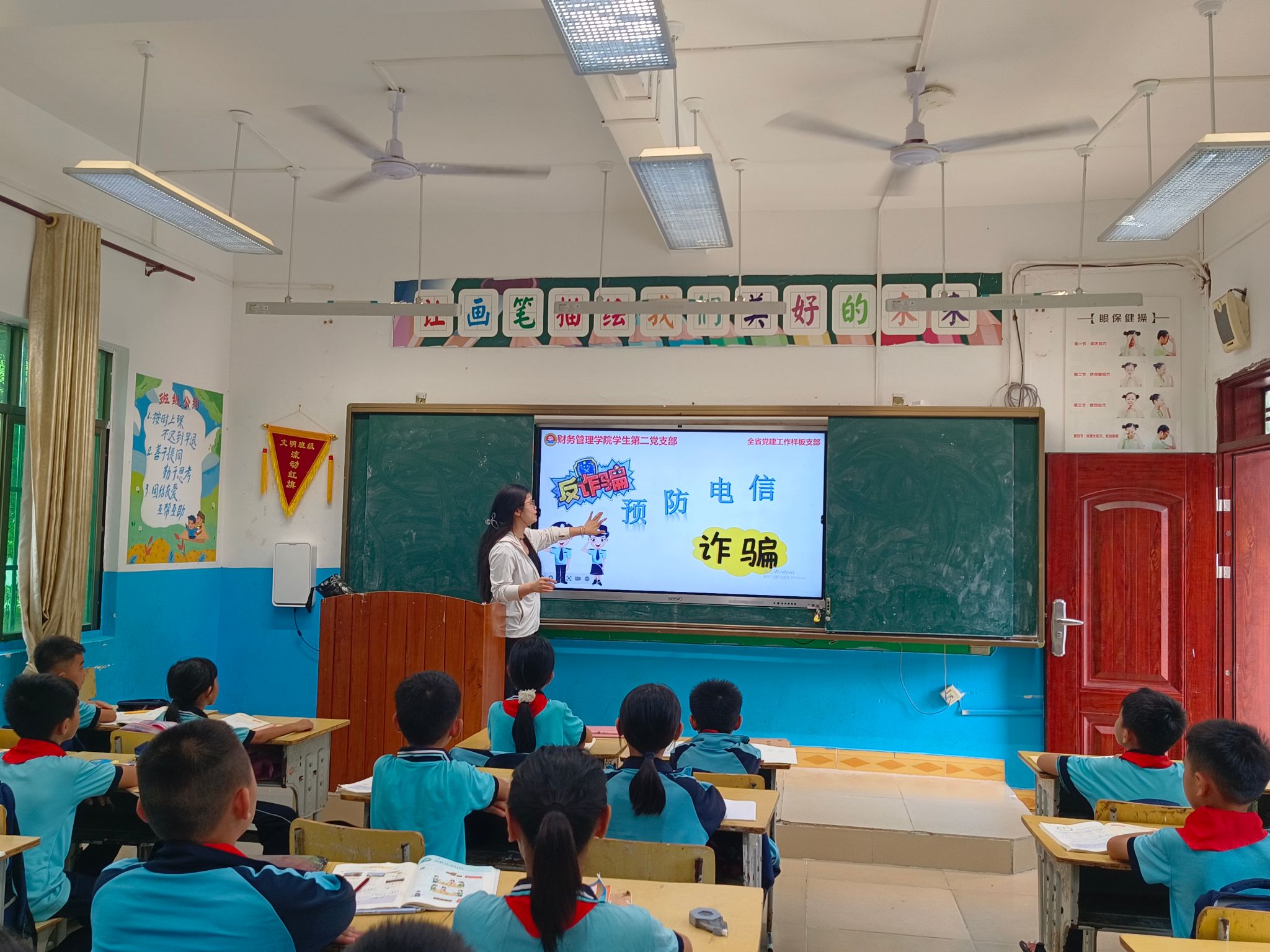 活动中,党支部师生党员和入党积极分子分为4组,通过宣传单发放、图文讲解和视频播放相结合,用通俗易懂的语言给一年级、二年级和五年级的学生讲解校园霸凌案例及其预防措施、学生溺水案例及其预防措施,引导学生增强安全意识,构建平安和谐校园。给三年级的学生讲解金融知识及理性消费、电信诈骗及防范措施,引导学生提高警惕应对各类诈骗,避免陷入各类游戏道具购买和网络主播打赏等引诱消费陷阱,帮助学生树立正确的消费观和金钱观。给四年级的学生上了一场精彩的推广普通话课程,通过小故事大道理、小小挑战赛、小小朗诵家等模块引导学生写好规范字,讲好普通话。财务管理学院还邀请了国家二级心理咨询师、中级社会工作师杨玖林给六年级的学生作团体心理辅导,通过传递呼啦圈、扔乒乓球、群龙取水等游戏培养学生健康心态和合作精神,助力学生阳光成长。
