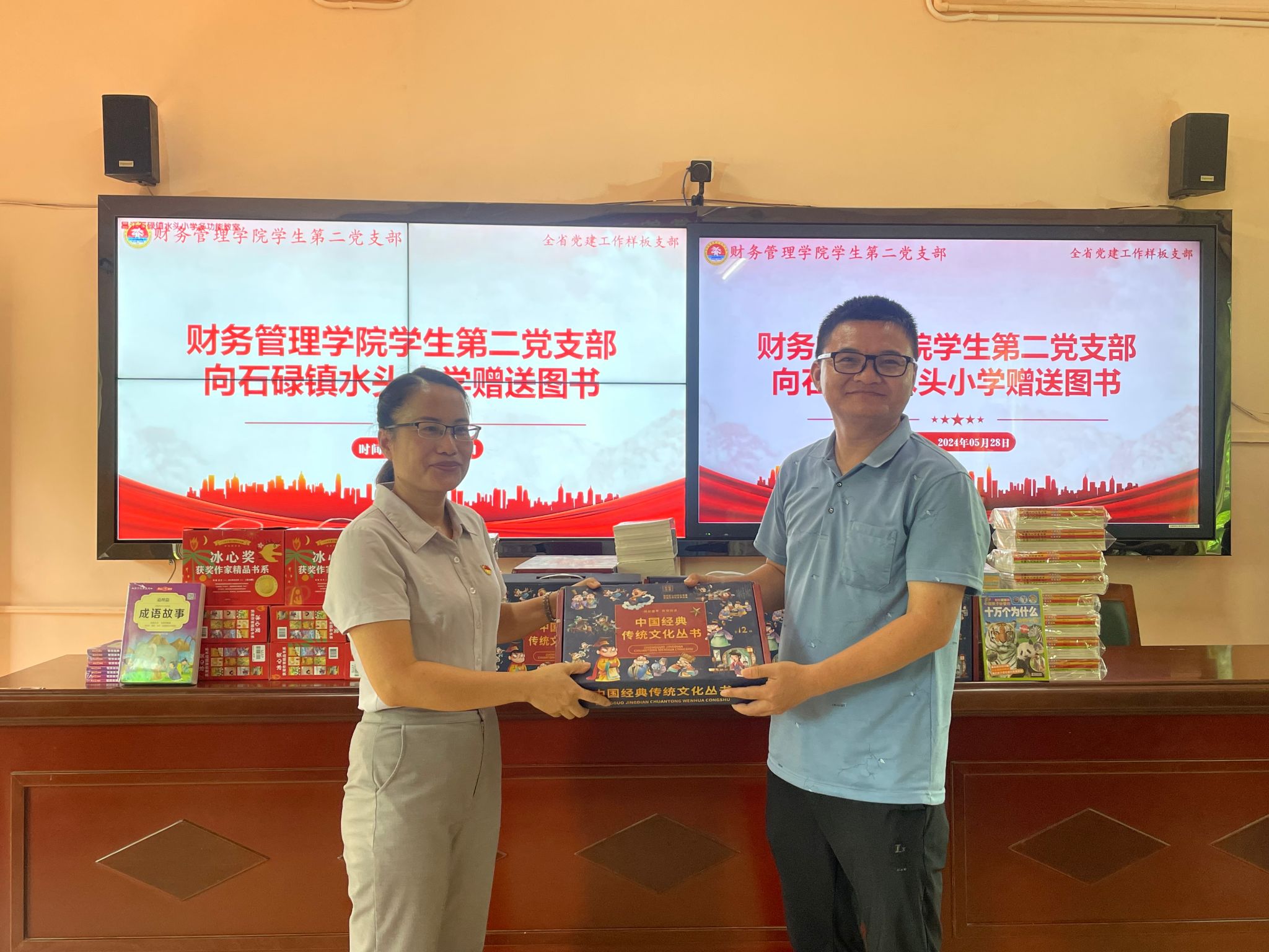 财务管理学院学生第二党支部向水头小学赠送《中国经典传统文化丛书》《中国少年儿童百科全书》《中国孩子钟爱的十万个为什么》《写给儿童的中华上下五千年》《中华成语故事大全》等7类图书43套共计396册图书,助力学生养成好读书、爱读书、读好书的良好习惯。