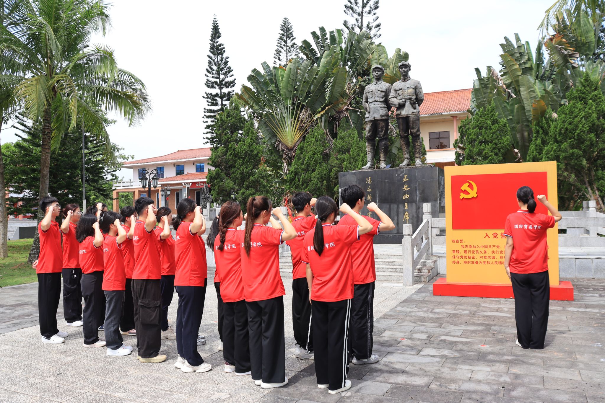 在琼崖革命先烈王文明主席、冯白驹将军雕像前,全体党员面向鲜红的党旗,举起右拳,庄严肃立,重温入党誓词,进一步坚定共产党员的理想与信念。