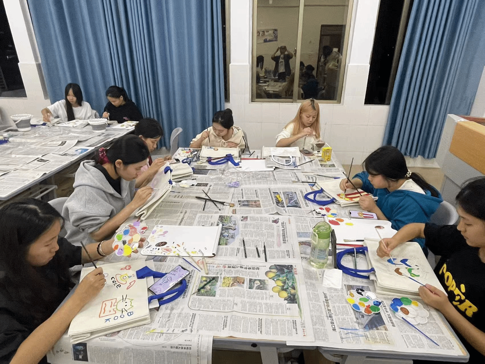同学们展现出高度的热情,伴随着轻柔的音乐,在纯白的帆布袋上自由创作,用画笔描绘出心中的理想世界。在绘画的过程中,同学们将平时难以言说的感受转化为可视的图像,不仅关注自己的内心世界,而且在无声中与他人分享着情感和困惑。画笔成为了他们情感表达的工具,色彩和线条成为了他们内心语言的载体。