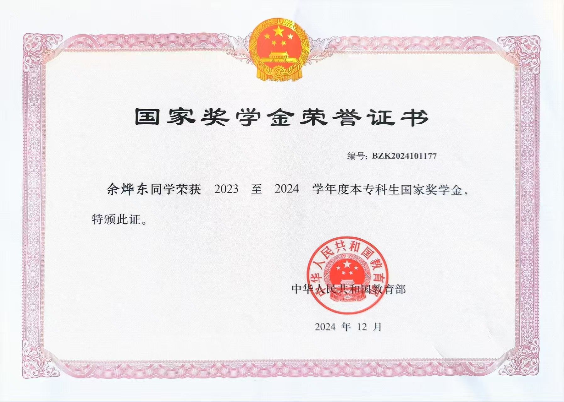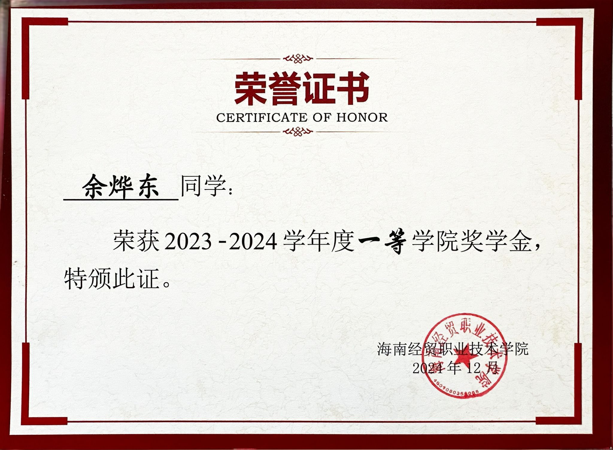 余烨东荣获多项荣誉