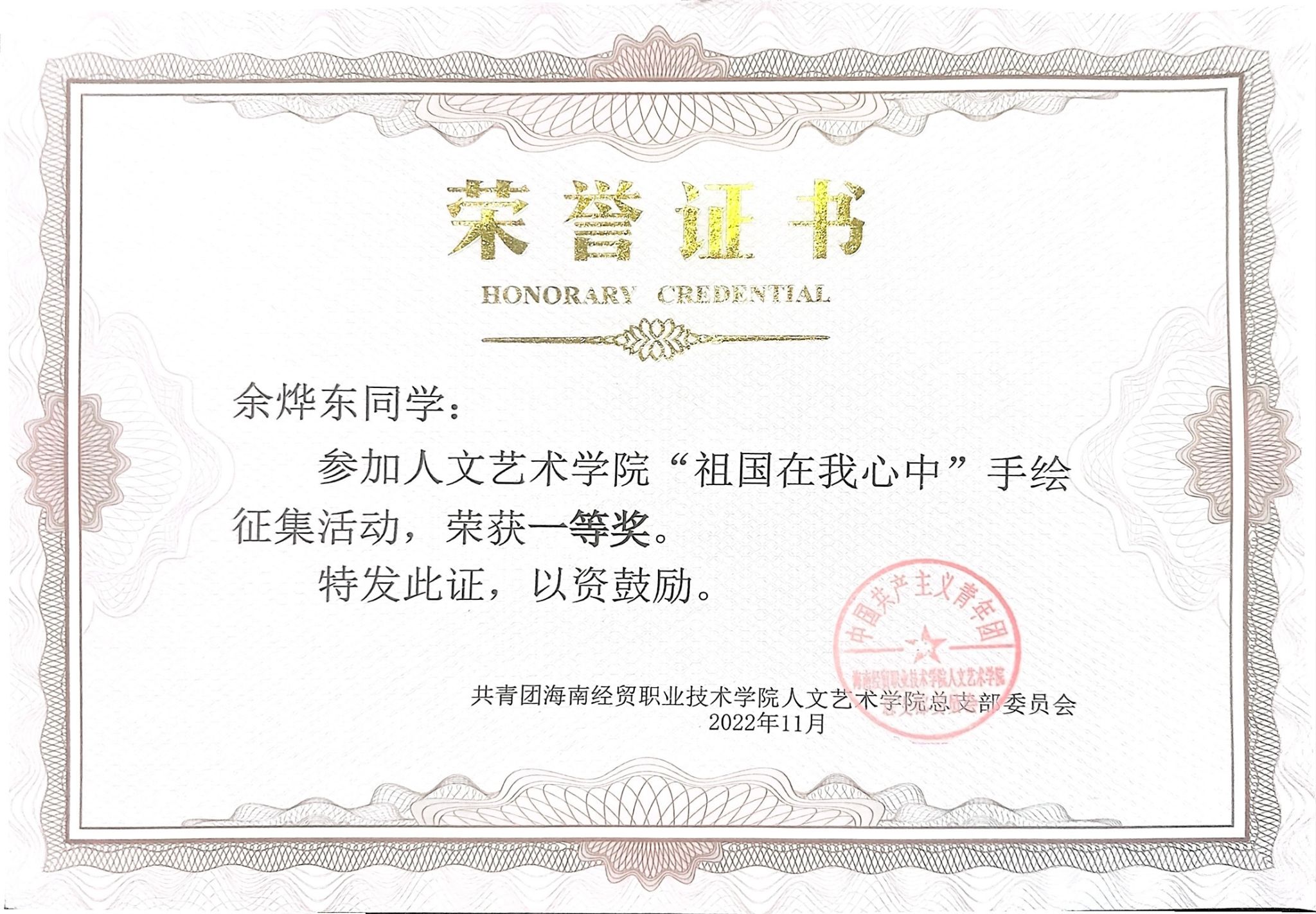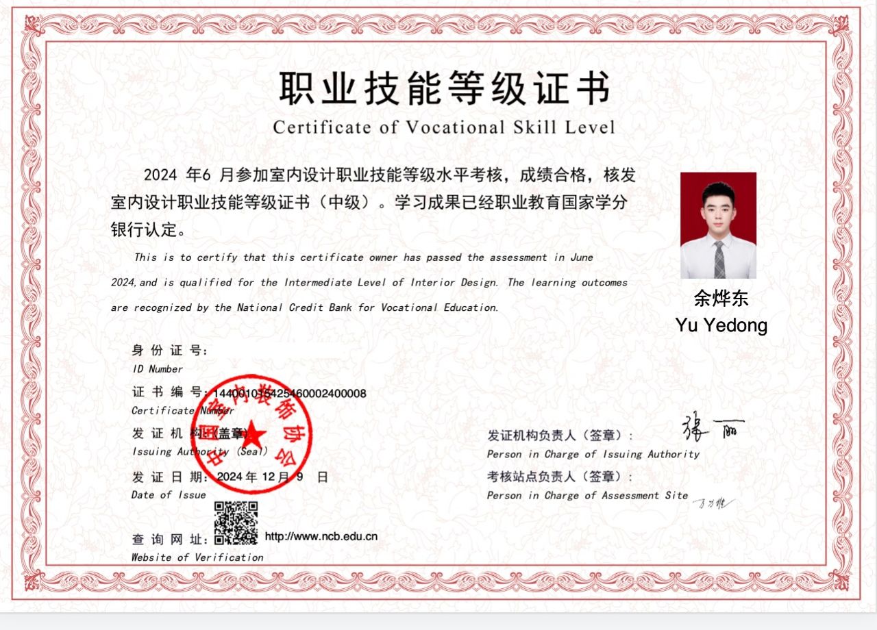 余烨东,中共预备党员,beat365vip官网登录入口人文艺术学院2022级环境艺术设计专业室内设计二班班长。曾获得2023-2024年度国家奖学金、2023-2024年度学校一等奖学金、2022-2023学年优秀学生干部称号;获得2023年全国院校室内设计技能大赛团体一等奖、海南省职业院校技能大赛高职组“环境艺术设计”赛项三等奖、第三届校园文化创意大赛优秀奖等国家级、省级、校级比赛20余项荣誉。
