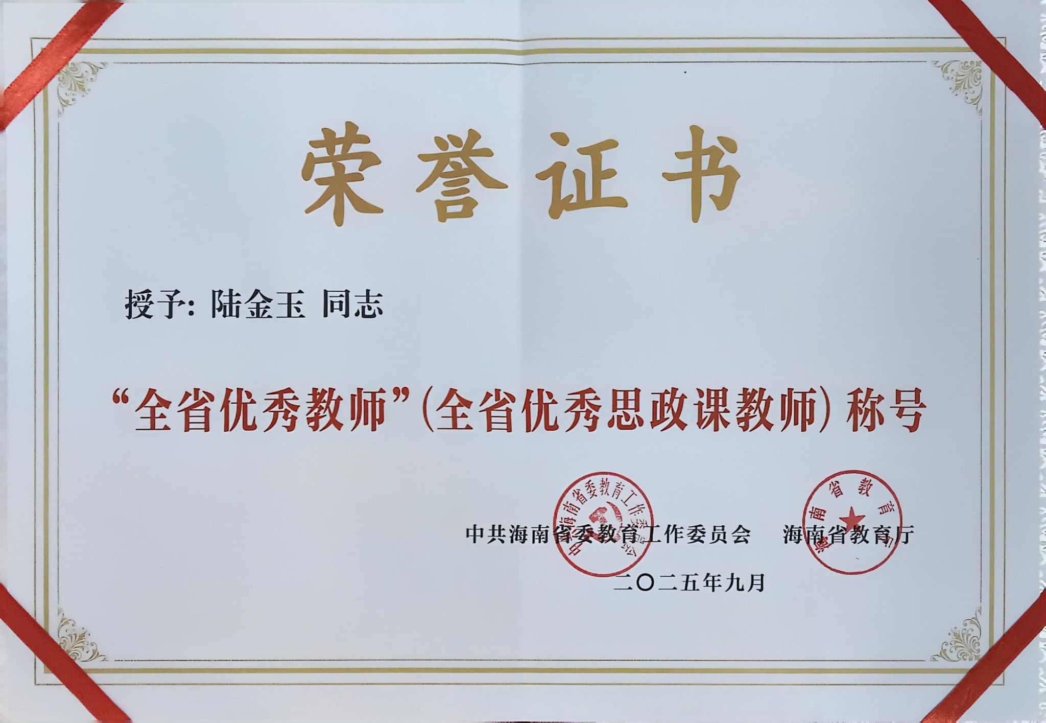 海经贸校友陆金玉荣获“海南省优秀思政课教师”称号