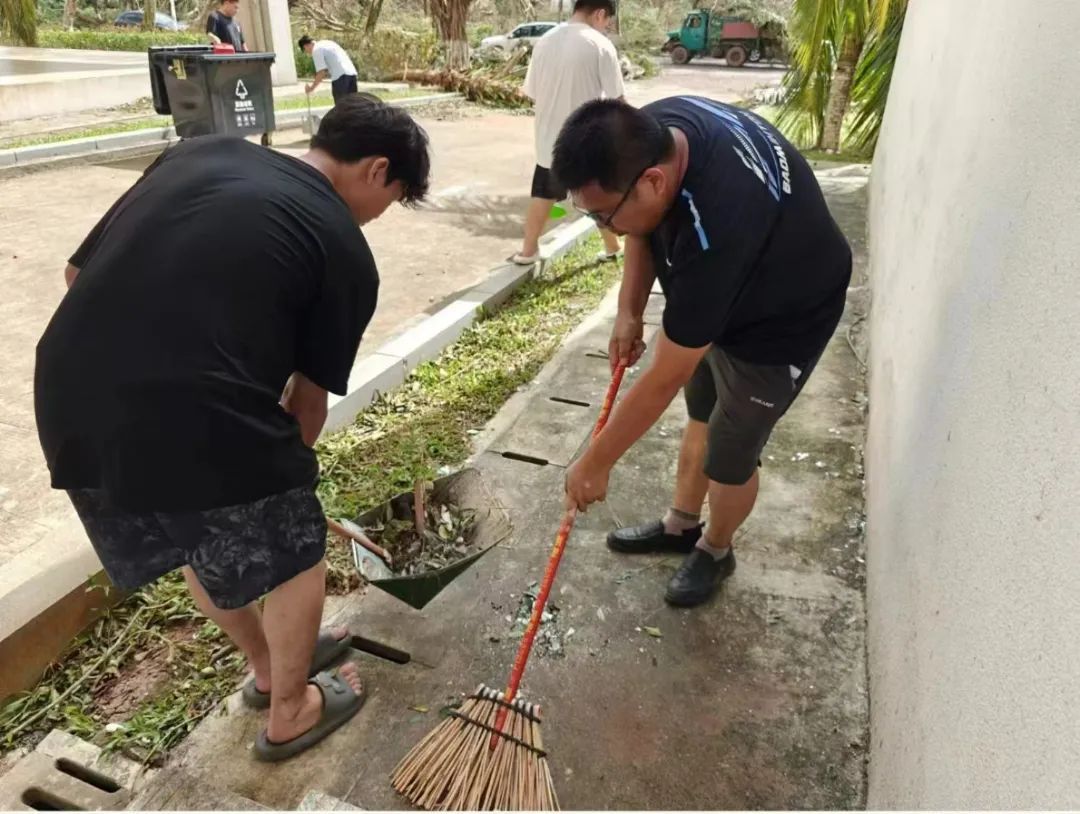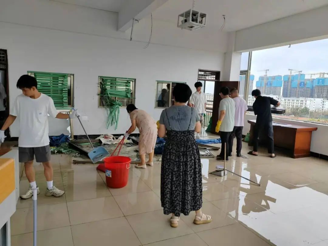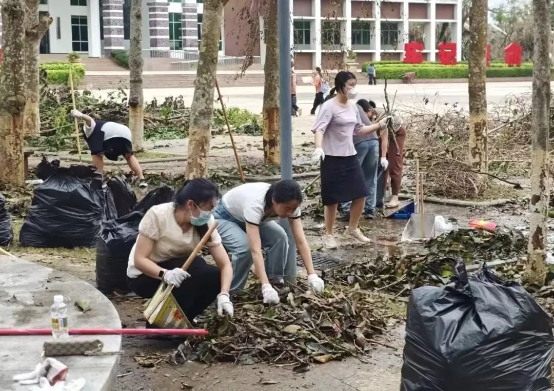 正是这样一个个普通平凡的辅导员,不顾个人安危,立足岗位,扛起了校园安全、学生安全的重任,在防御“摩羯”的过程中为同学们筑起了一道道坚实的安全防线。台风过境后,全体学工人员又投入到校园灾后恢复重建中。他们组织学生志愿者一起参加劳动,清理倒伏的树木、打扫卫生,助力学校尽快恢复正常的学习和生活秩序。