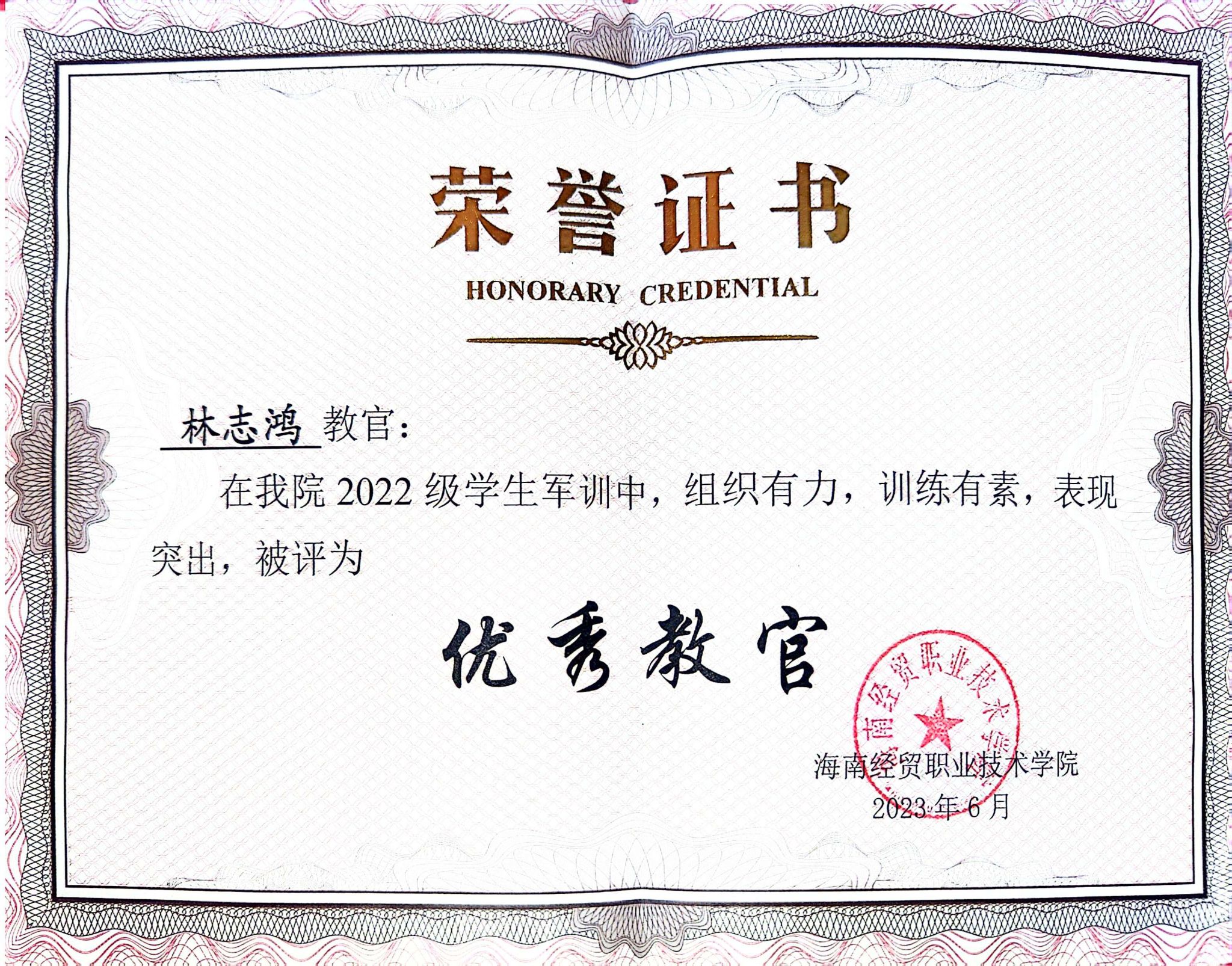2020年9月,林志鸿携笔从戎,在火热军营中锤炼自己。他苦练军事技能,严守部队纪律,锤炼军人本色,被部队评为“全优兵”并荣获嘉奖一次。退役复学后,他加入海经贸退役大学生志愿者队伍,在学校 2022 级学生军训中表现突出,被评为“优秀教官”。他时刻不忘军人本色,保持拼搏作风,助力学校国防教育建设。作为征兵宣传员,他向同学们宣传征兵知识并动员同学参军入伍,走进多所中小学进行国防教育宣传,培养青少年们的爱国情怀。